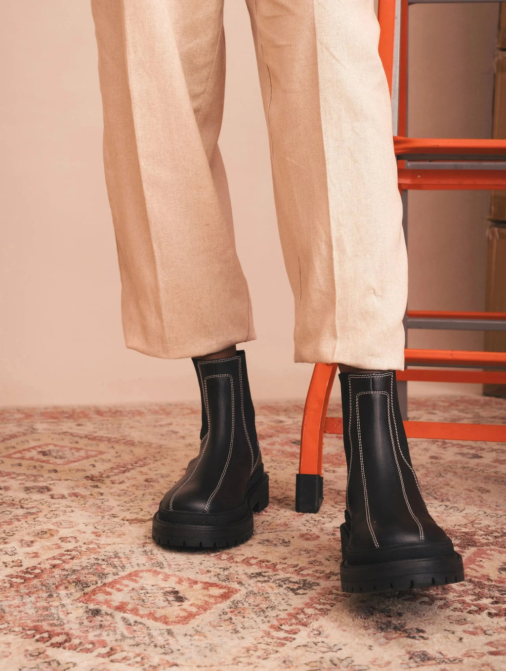 Unisex Chelsea vegan boots in black OnCross with bold contrast stitching. Featuring a chunky sole, 3 cm heel, and 2 cm platform for extra comfort. Ethically handmade in Portugal.