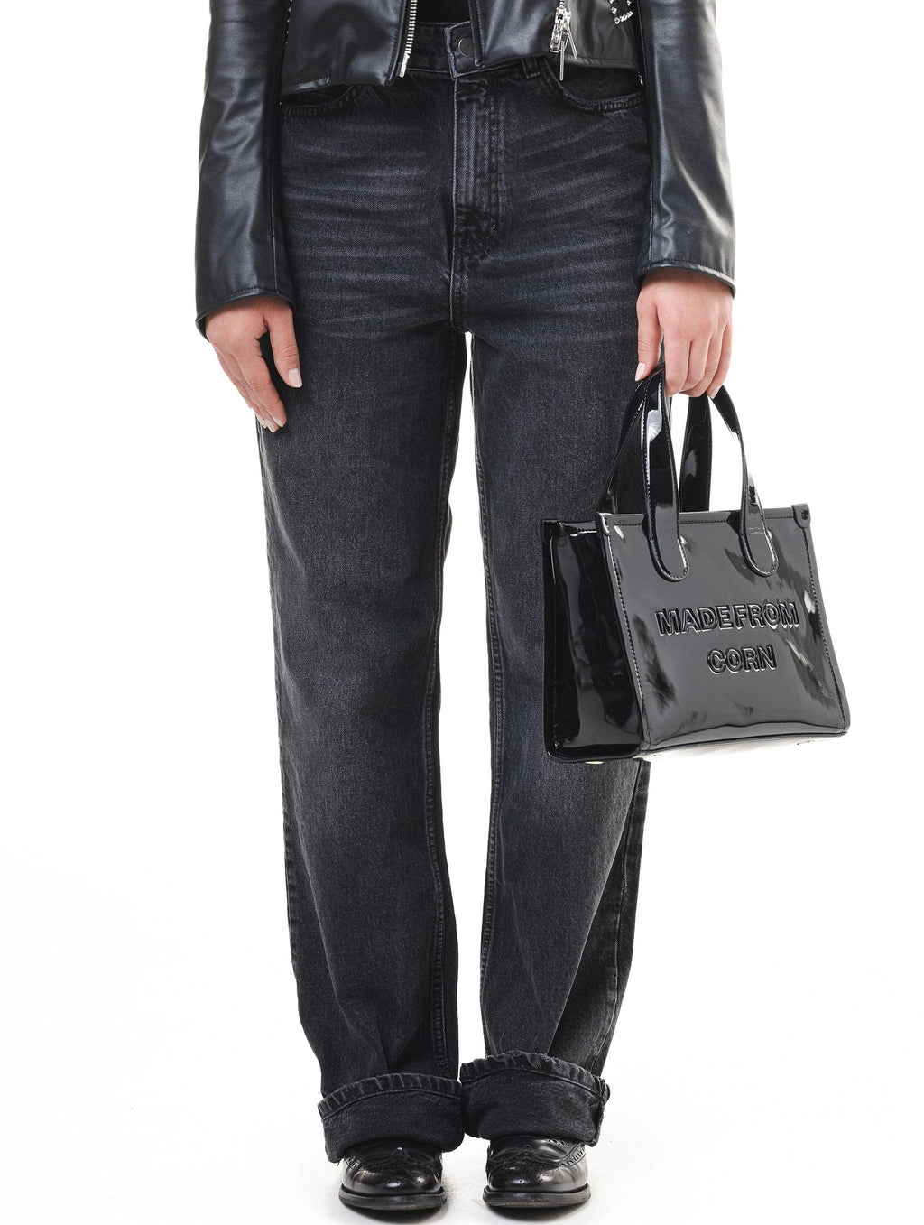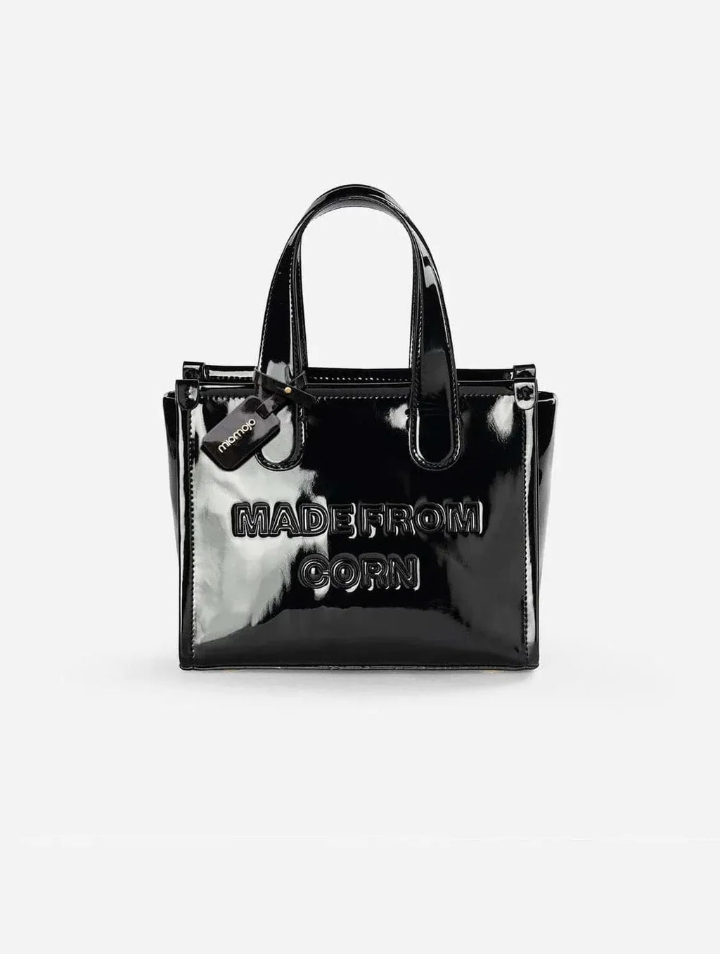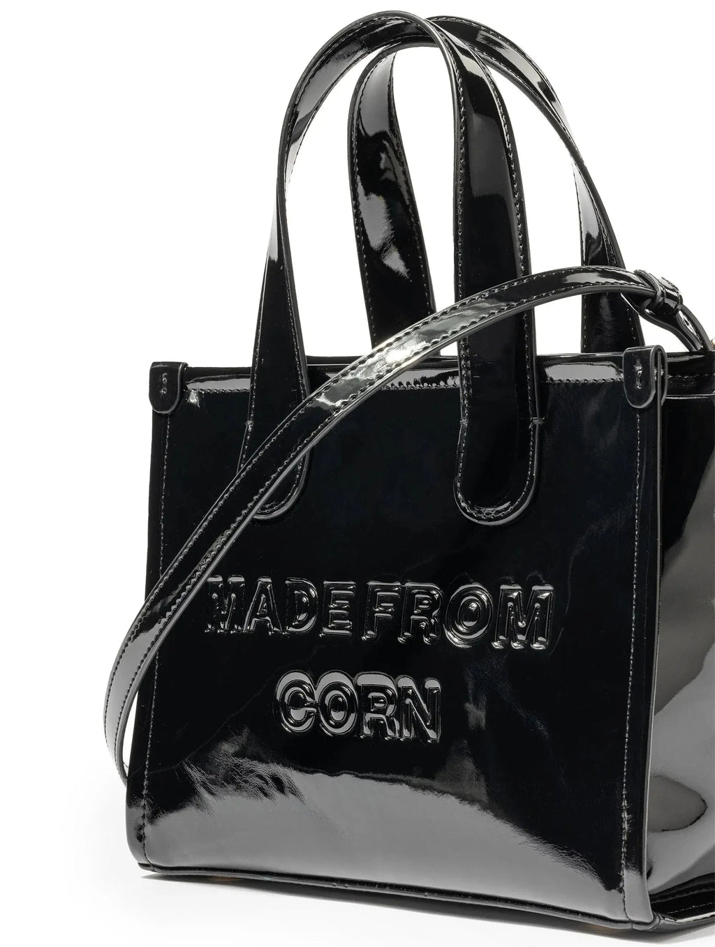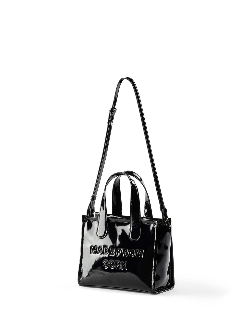The Alima Medium Tote in glossy black is the perfect blend of rock-chic elegance and practicality for your day-to-night needs. This medium-sized bag features an optional crossbody strap, making it as versatile as it is stylish. Crafted from Corn Leather, a sustainable BioVeg alternative to traditional leather. The sleek, shiny finish adds a touch of edginess, perfect for those who want to make a bold fashion statement.