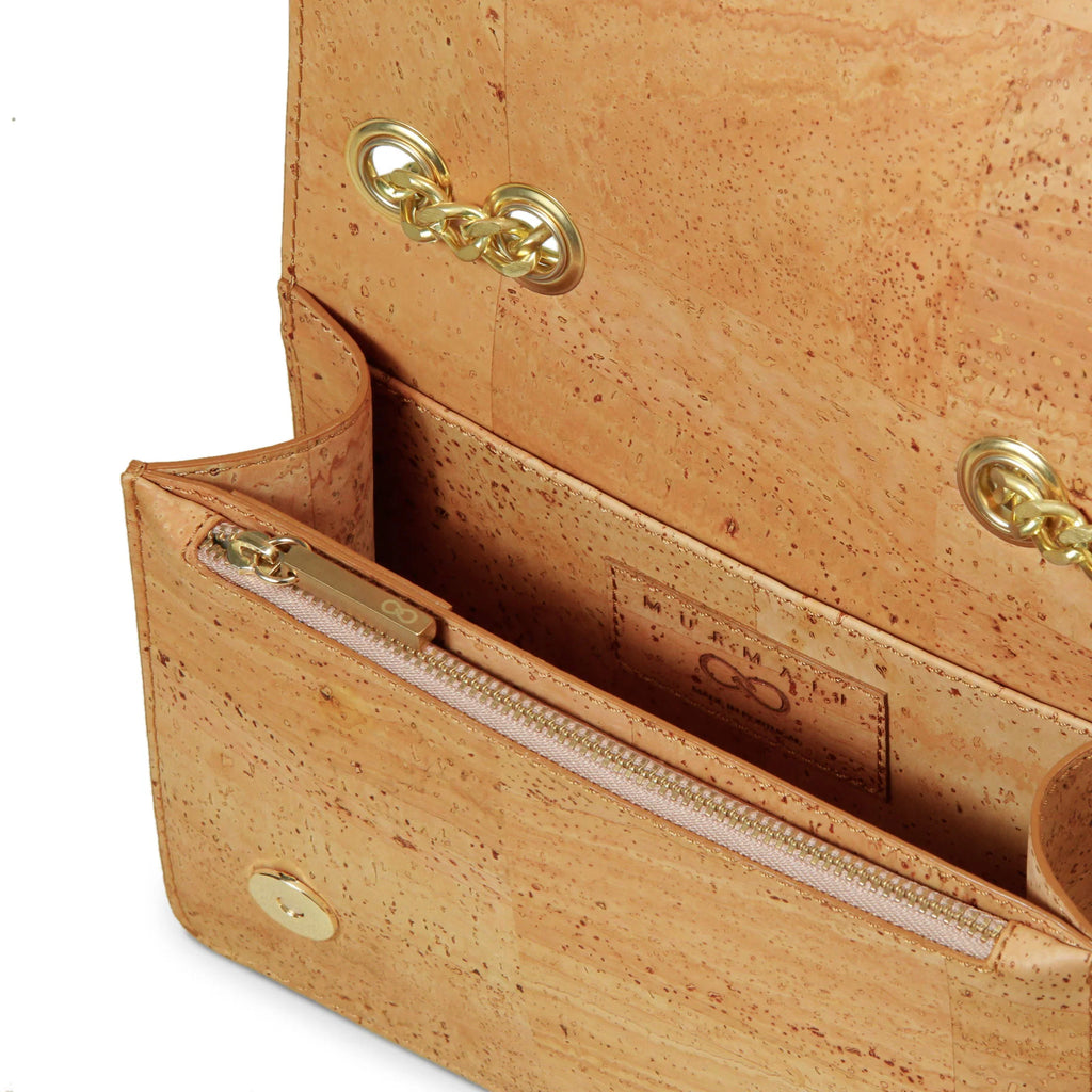 This handcrafted cork crossbody bag has been designed to “grab and go” – the perfect size to carry anywhere but still be able carry your life’s essentials with you. The chain can be shortened in half, so the bag can be carried by hand as well as over the shoulder.