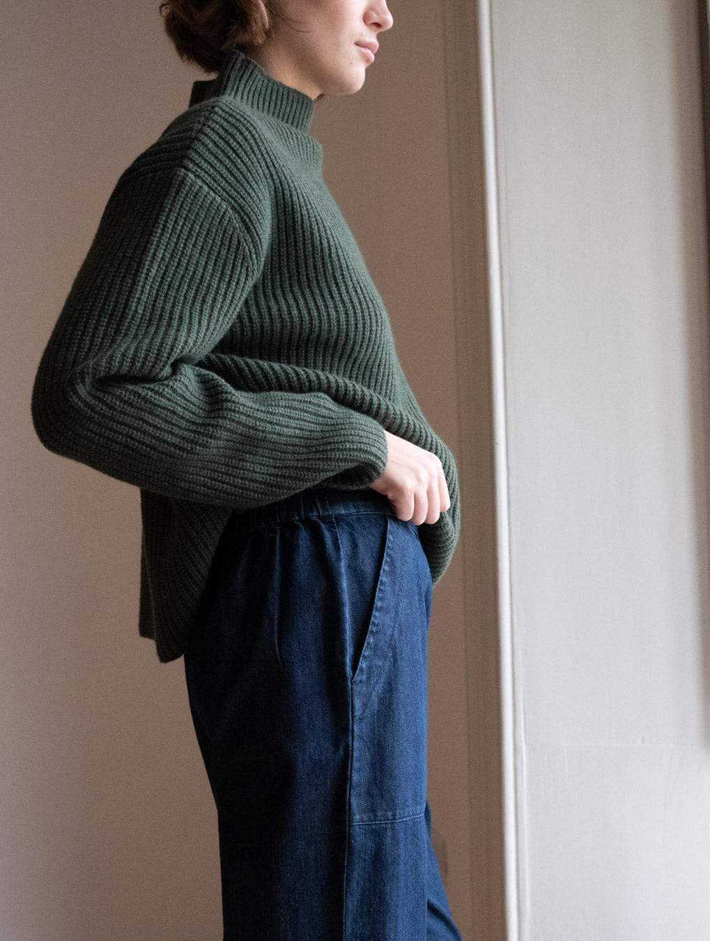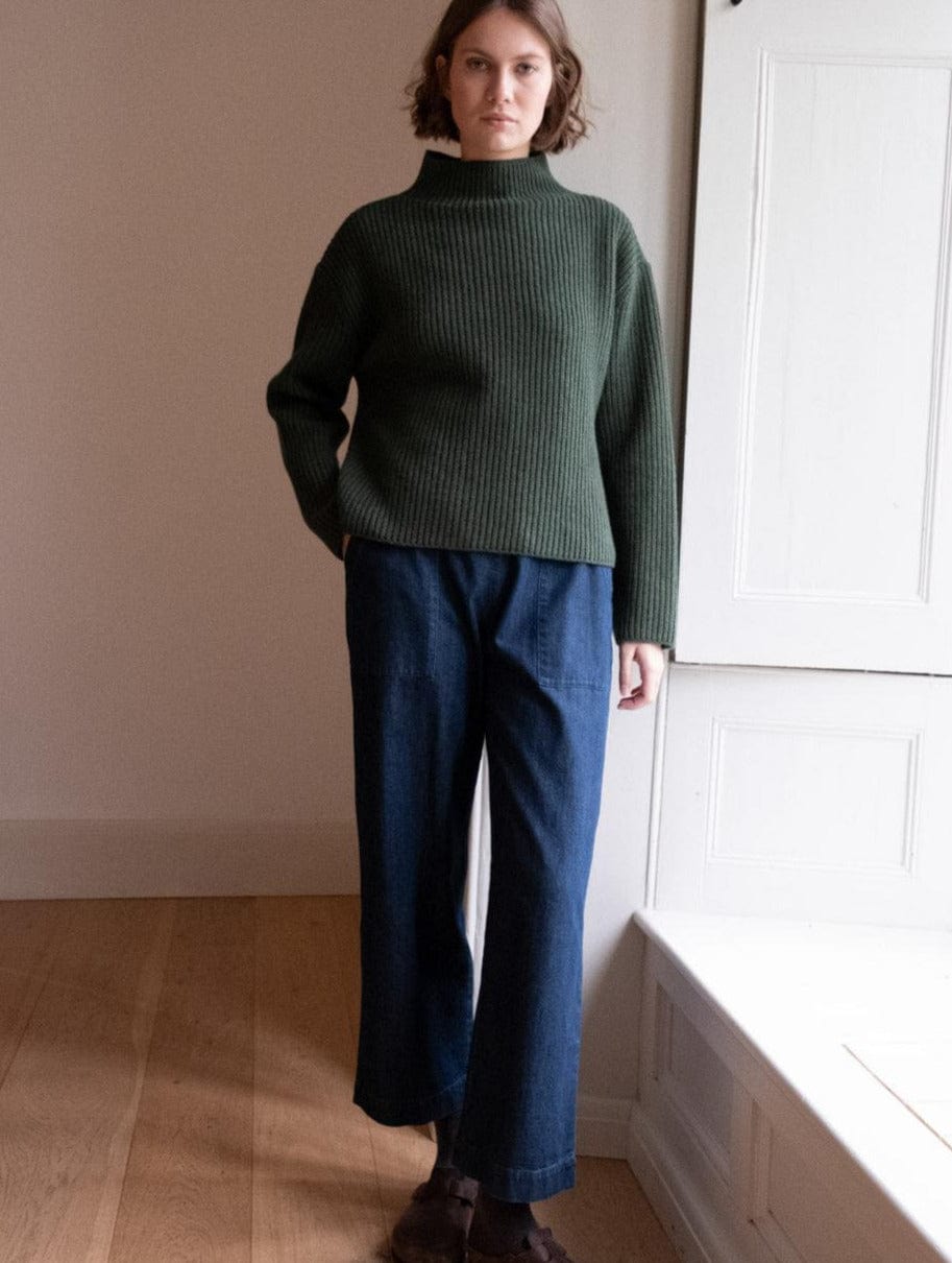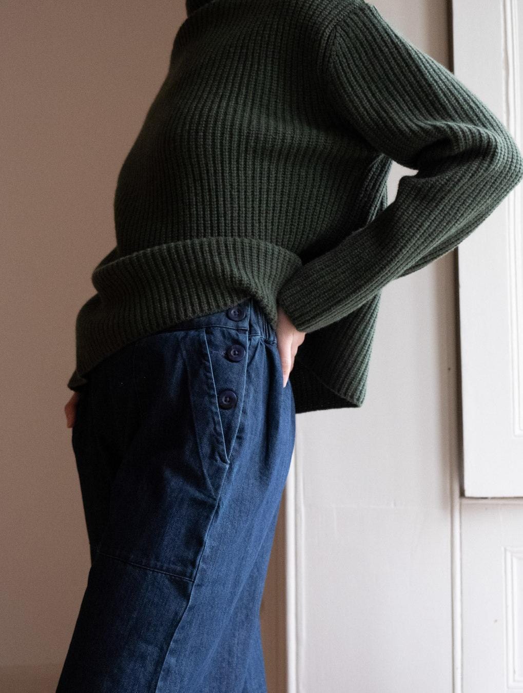 The Anna trousers are crafted from sturdy indigo denim and designed with comfort and everyday wear in mind. A flattering wide-leg silhouette with a simple waistband at the front and an elasticated back for an easy fit. Sits neatly at the waist and fastens with a buttoned side opening. Finished with deep, top-stitched carpenter-style pockets for added practicality. A full-length, straight-cut trouser made to last and to be lived in season after season.