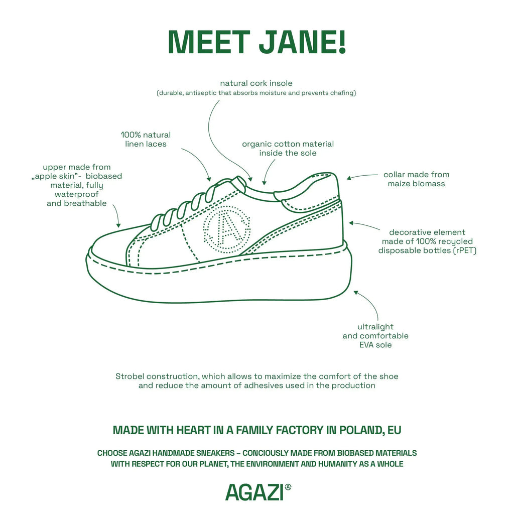 In the case of the JANE model, we decided not to add any unnecessary details or decorations, apart from one! On the back of the upper, we used a small, checkered material, made of 100% recycled disposable bottles.
