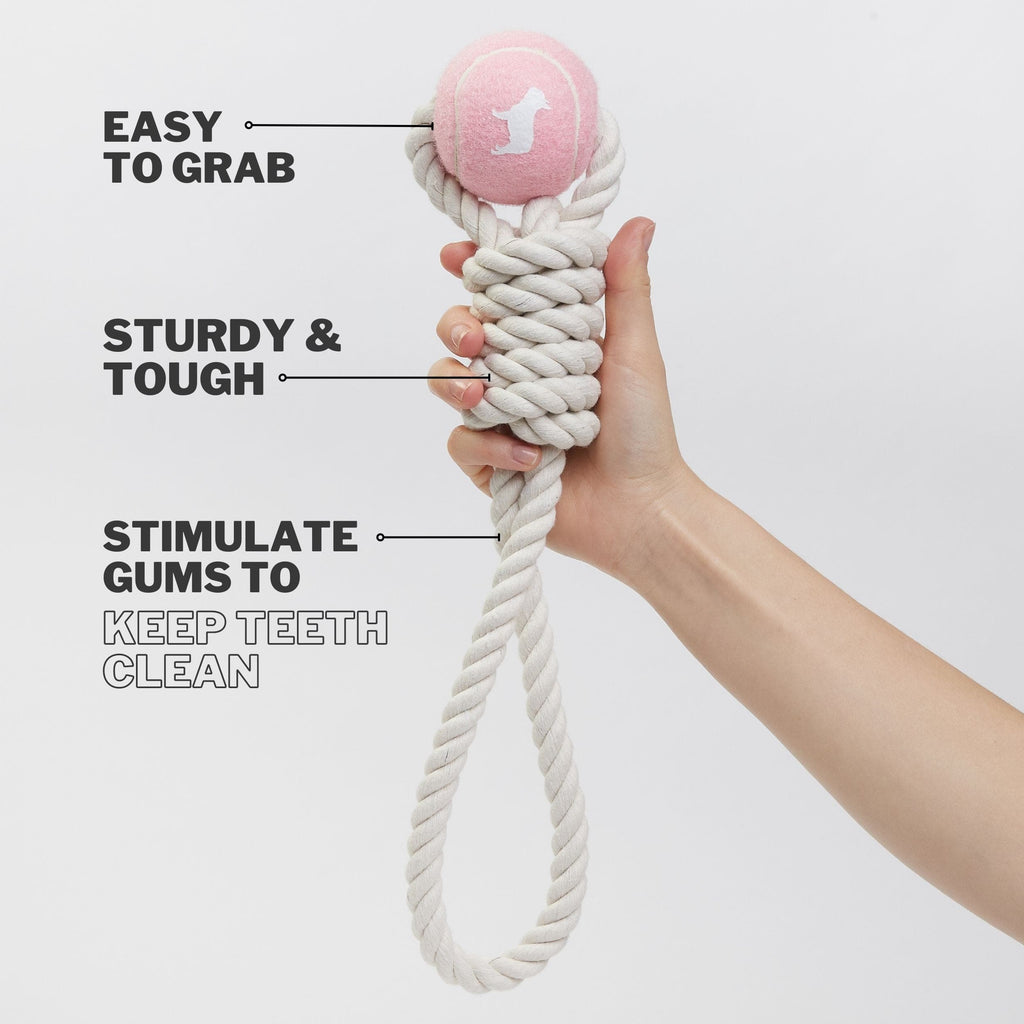 The rope itself is sturdy and tough creating a loop for easy grip and features our popular pink tennis ball so it’s easy for your pup to grab hold of.