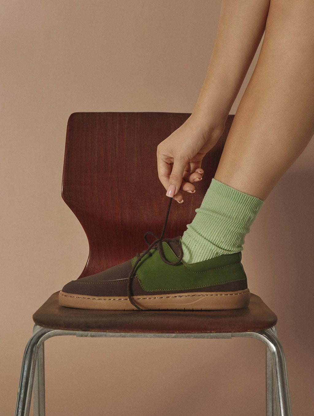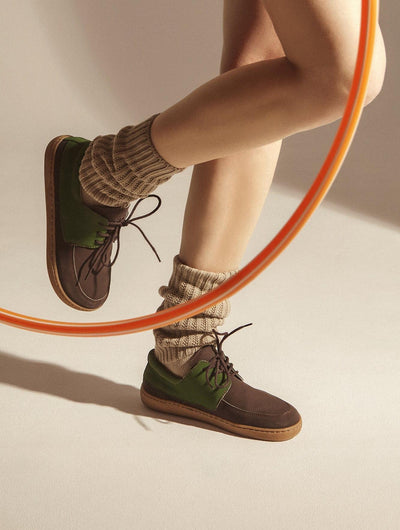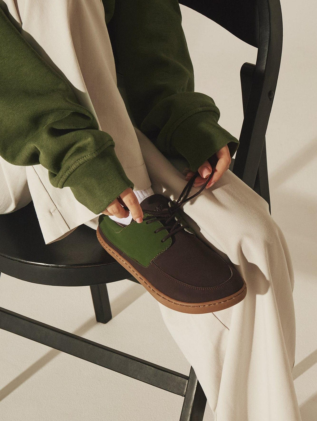 This model, inspired by a classic silhouette, is crafted from the finest vegan plant-based leather (70% bio-based). A deep brown upper paired with matte green accents around the lacing creates a calm, earthy palette – perfect for walks not only in the forest.