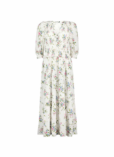 Melania is one of those dresses which instantly makes you feel put together! Crafted from soft crepe with bouquets of joyful florals, the top features a deep v-shape neckline and pretty ties. While the bodice is entirely smocked for a neat fit, by contrast the tiered skirt is floaty and free. Wear it to dazzle at every upcoming social event in your calendar!