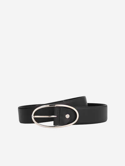 Featuring an oval buckle clasp, sewn edges, and a square tip, this belt embodies modern sophistication.