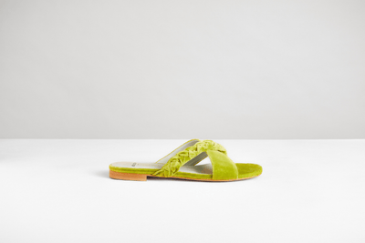 Open Sandals, light and airy with its refined braid, in green "Acido" Velvet from Italy.