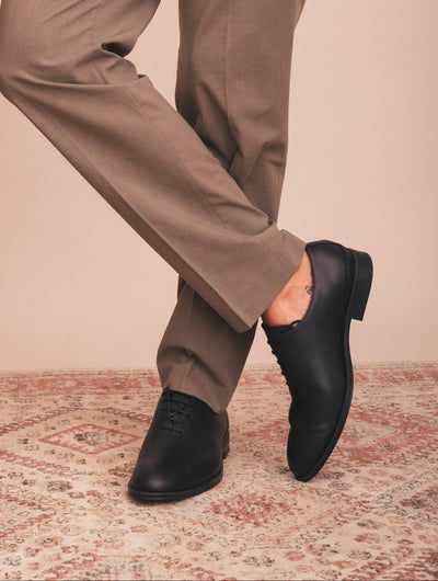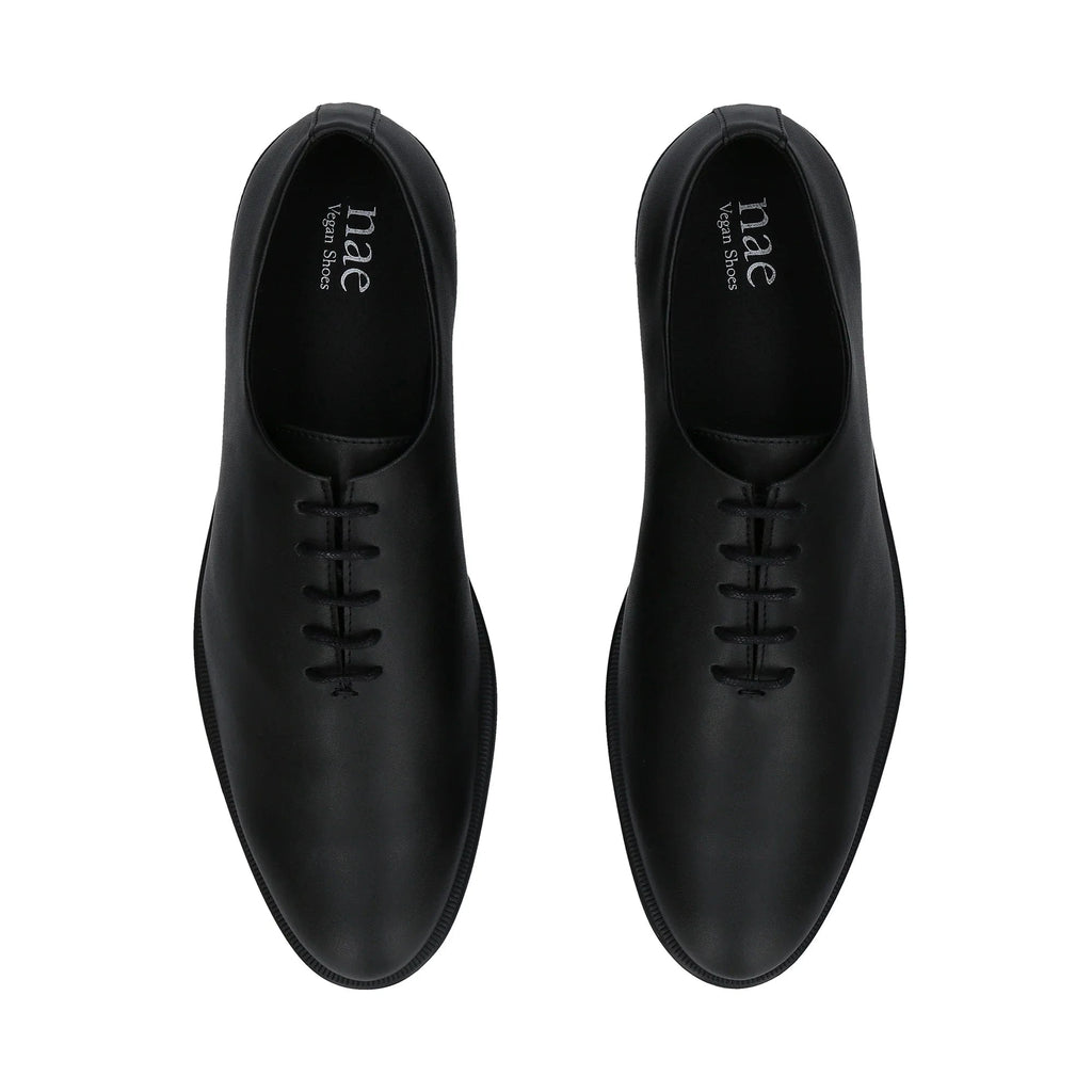 This vegan Oxford shoe for men is a wardrobe classic, crafted in Portugal from black On Micro Pure material with a polished finish. Features a low 2 cm heel and 1 cm rubber sole for elegance and comfort.