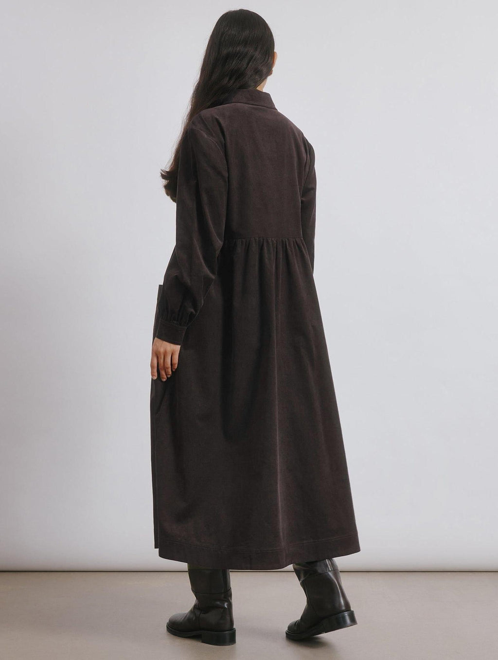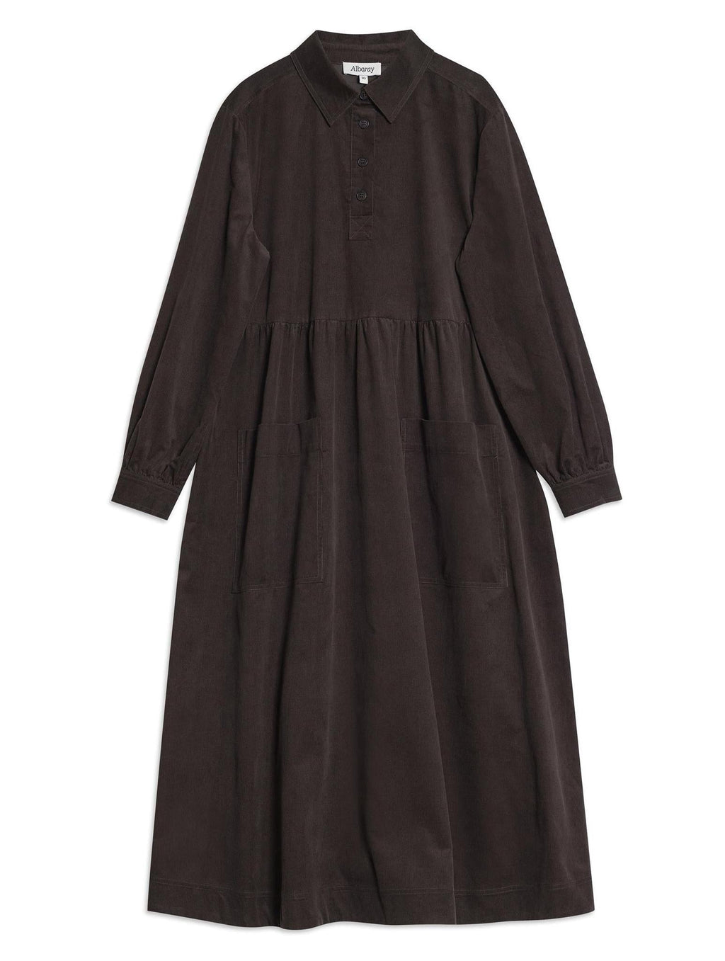 A long sleeved midi dress crafted from the softest chocolate cord. Featuring a collar and button placket, flattering empire waist detail and front patch pockets.