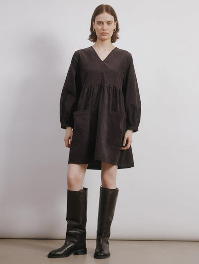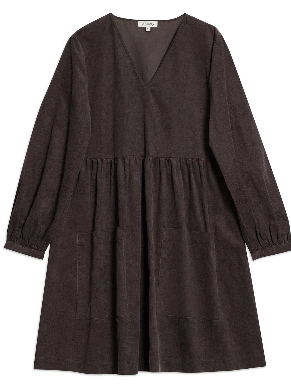 Indulge in the luxurious comfort of this V-neck short dress made from smooth and cosy baby cord fabric. The blouson sleeves and gathered empire waistline create a voluminous silhouette, adding an elegant touch to the dress, which also features front patch pockets for a stylish yet functional detail.