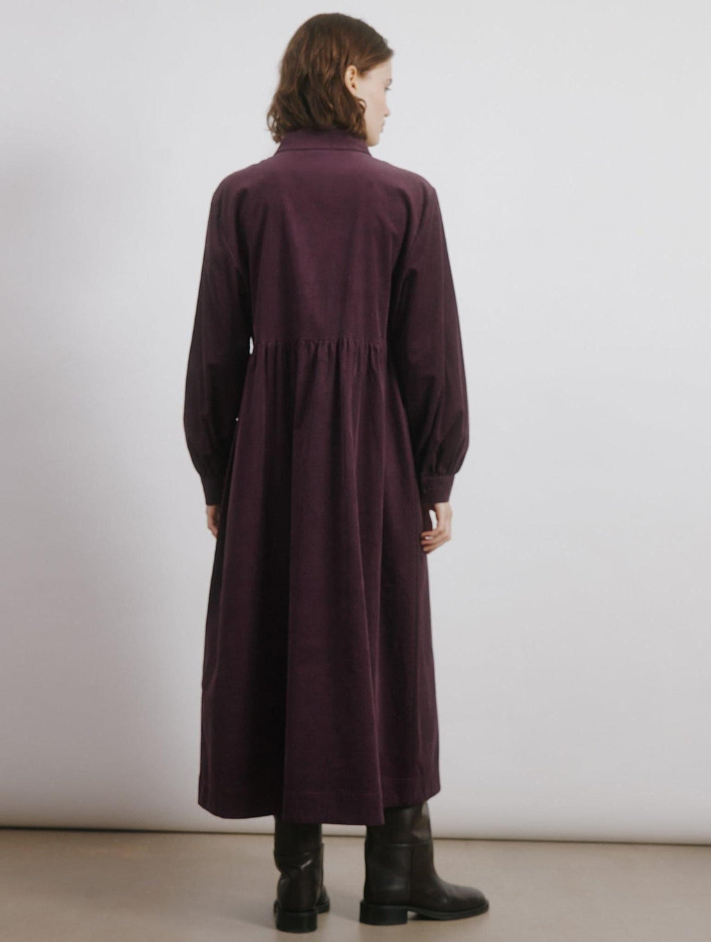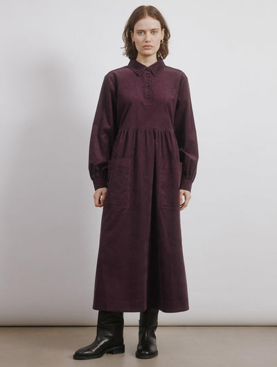 A long sleeved midi dress crafted from the softest burgundy cord. Featuring a collar and button placket, flattering empire waist detail and front patch pockets.