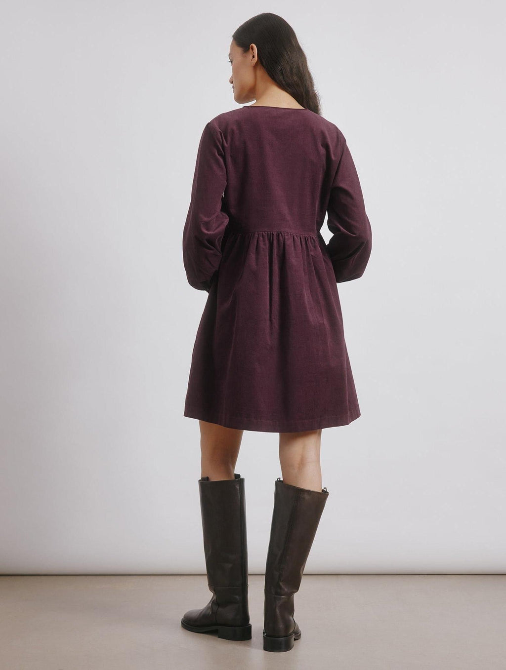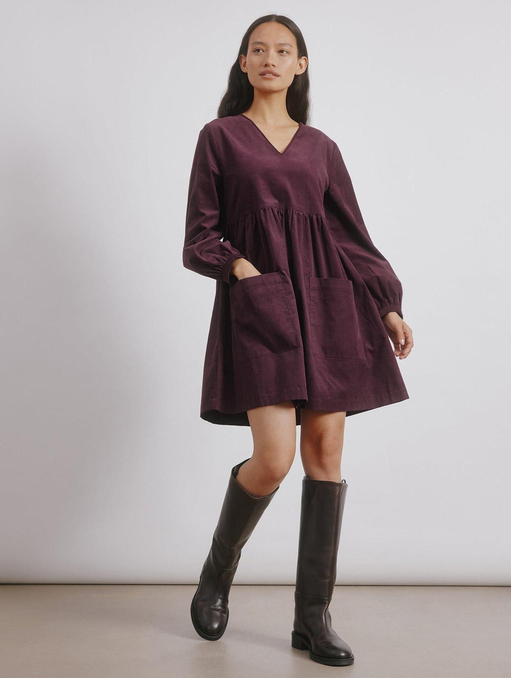 Indulge in the luxurious comfort of this V-neck short dress made from smooth and cosy baby cord fabric. The blouson sleeves and gathered empire waistline create a voluminous silhouette, adding an elegant touch to the dress, which also features front patch pockets for a stylish yet functional detail.
