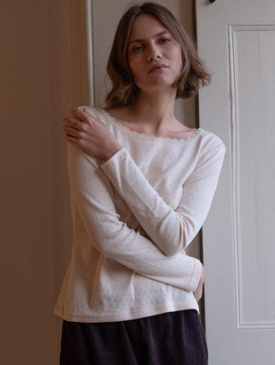 The perfect base layer — soft, simple, and endlessly wearable. Made from pure 100% organic cotton this ribbed top has delicate pointelle detailing and a scooped neckline with scalloped lace trim. The fabric is a rich, super soft jersey cotton. It can be worn as a long-sleeved T or as an extra thermal layer when it is very cold. This season's colours are dove grey and ecru.