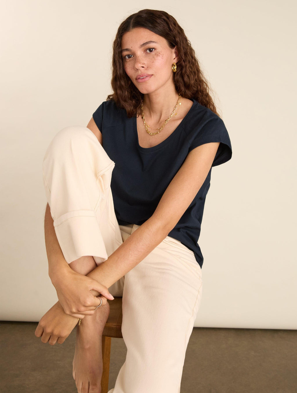 A customer favourite, the Catherine Tee provides a considered take on a wardrobe classic. Its scoop neckline and capped sleeves create a slim and feminine fit. Now available in navy, this is a staple which goes with literally everything. Crafted in organic cotton, it feels soft, looks premium whilst reasuringly low-maintenance.