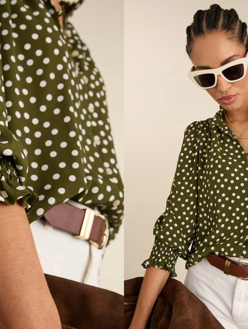 Pretty, easy and great for instantly elevating an outfit, the Cela Blouse is brilliantly hard-working. In dark olive with cream spots, it goes with trusted classics like black trousers and indigo denim and will also work with white jeans. Crafted in responsibly-sourced crepe, its drapey fabric is topped with a frilly collar, gathered sleeves and shirred cuffs. Our favourite detail is the rouleau loop button fastenings.