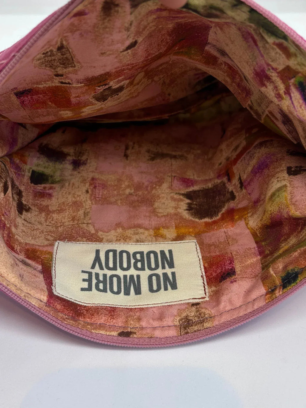 Its soft, quilted texture gives it a timeless, tactile feel, while the pink makes it a feminine standout piece. The pouch is finished with a matching zip and lined with recycled viscose twill in our exclusive No More Nobody print, a hidden pop of colour and personality, plus our logo for that little moment of joy every time you open it.