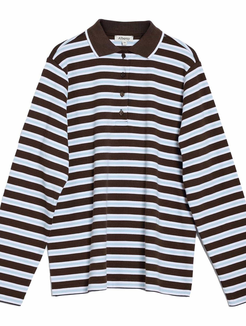 This chocolate striped polo shirt features a contrasting trim on the collar, long sleeves, and a front button closure, combining style with comfort for your everyday wear.