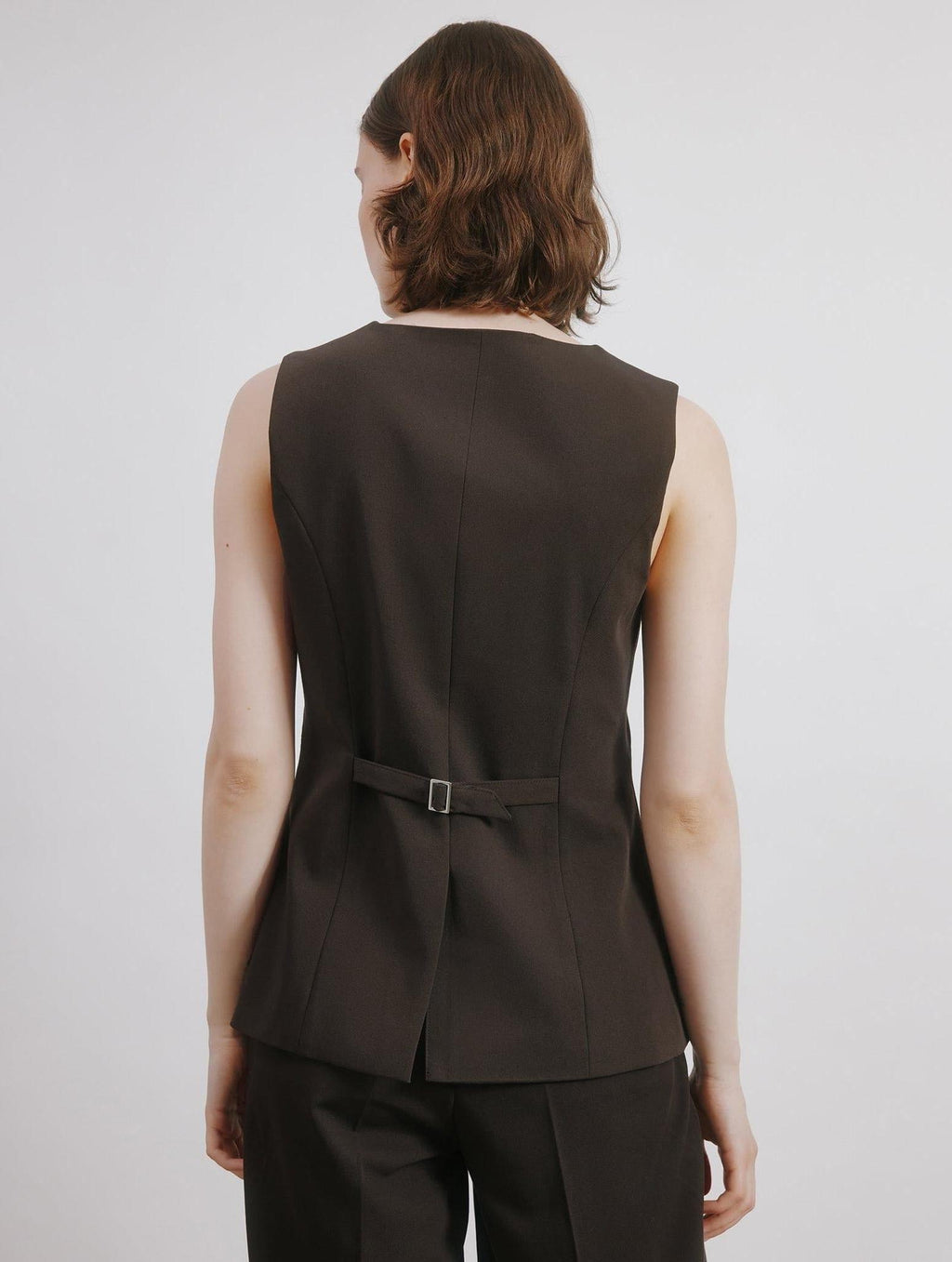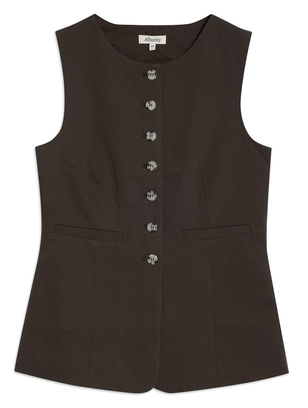 A stylish waistcoat in a rich chocolate colour, the mock horn button closure and longer line silhouette adds both functionality and fashion to your wardrobe. This style is fully lined and can be worn as an item piece or with its co ordinating bottoms.
