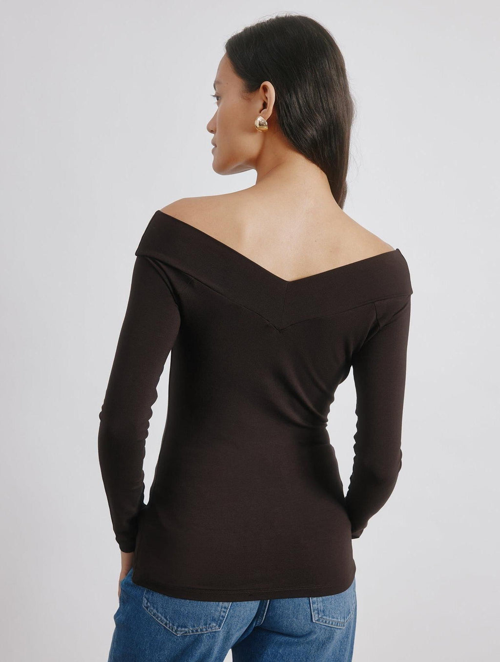 Indulge in a touch of elegance with our chocolate V bardot top, designed to flatter with its off-the-shoulder bardot neckline. Crafted from a soft and stretchy yarn this top combines comfort and and style.