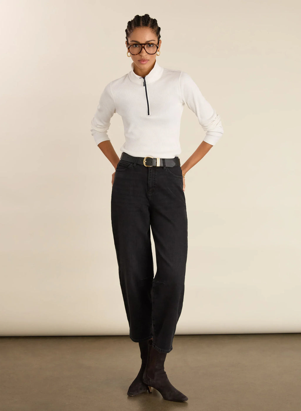 For a cool alternative to a rollneck, consider our Clayton Zip Turtleneck Top in white. Crafted in soft and stretchy organic cotton rib jersey, it’s cut for a slim fit with a funnel neck. The chunky black zip, which is crafted from recycled materials, creates a cool contrast. Easy to wear on its own and perfect for layering. We’ll be styling it under blazers for a sporty accent. .