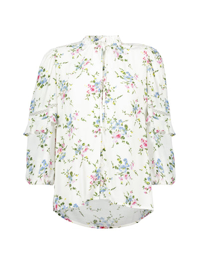 As its name suggests, this is one for all the romantics out there! Clemenza comes in soft crepe with printed bouquets of joyful florals. Its relaxed shape is so easy, and embellished with a frill collar, neck ties, and ruffles on the sleeves. Certain to put a spring in your step, we’ll be wearing it with jeans all season long.