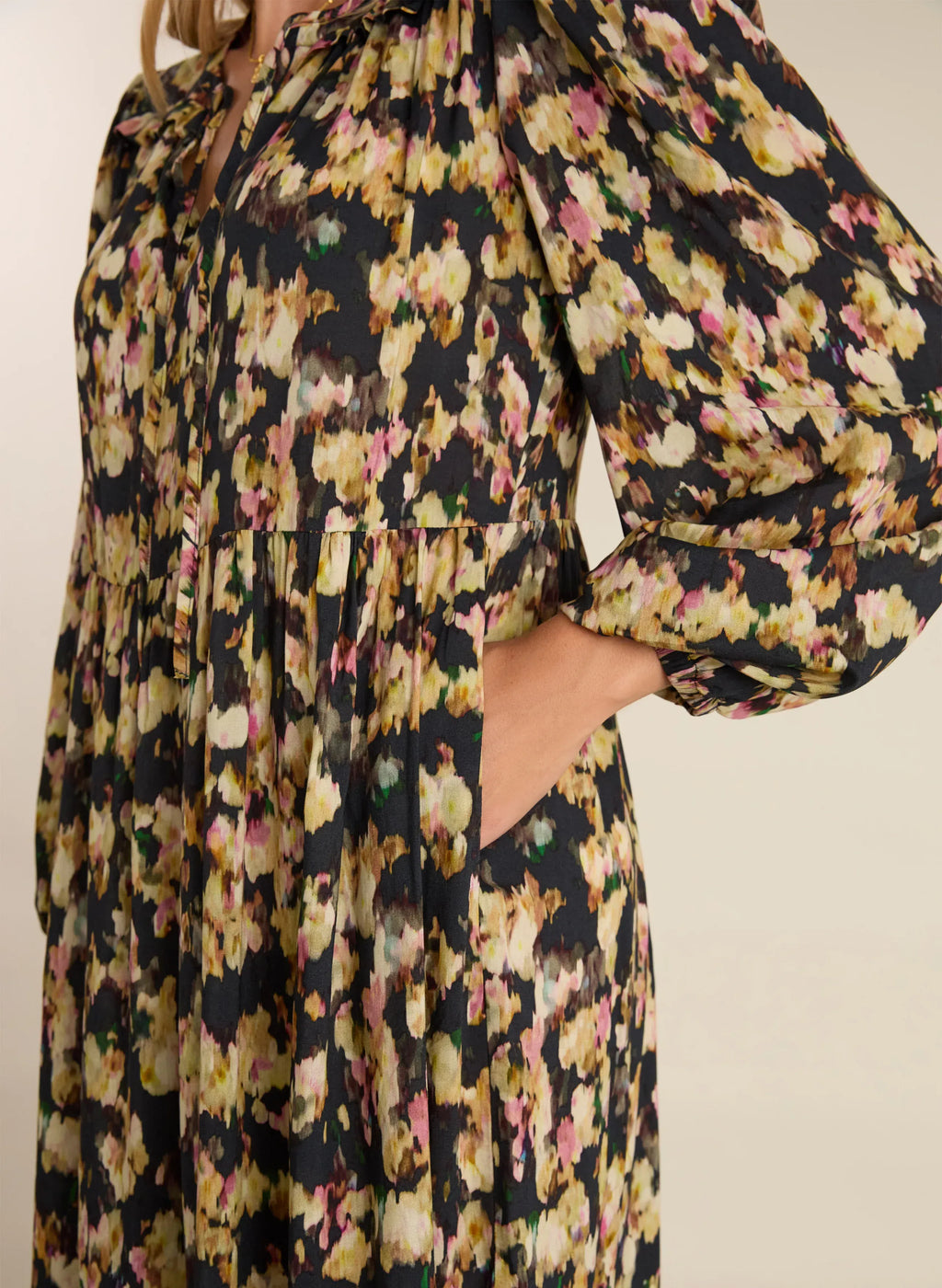 Look no further than our Cleo Midi Dress for an easy day to evening dress. It’s loaded with a pretty blossom print on a dark base and simply pulls on. Floaty and relaxed, it’s crafted in responsibly-sourced voile and features a full skirt with a tier. Two ties at the neck opening and frills along the shoulders make it feel elevated. Versatile and effortless, you’ll find yourself wearing it on repeat!