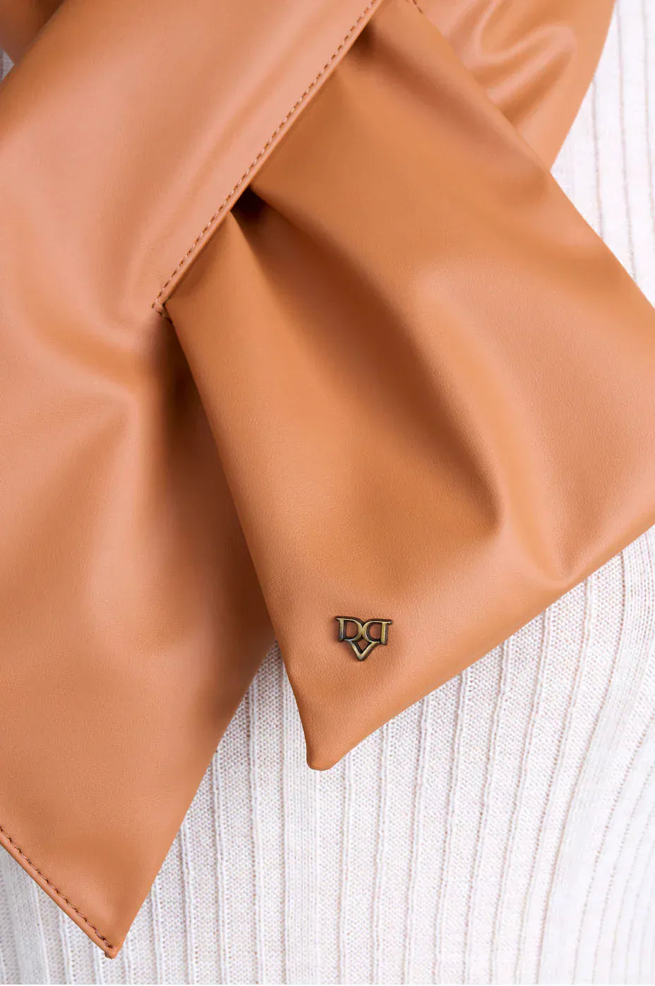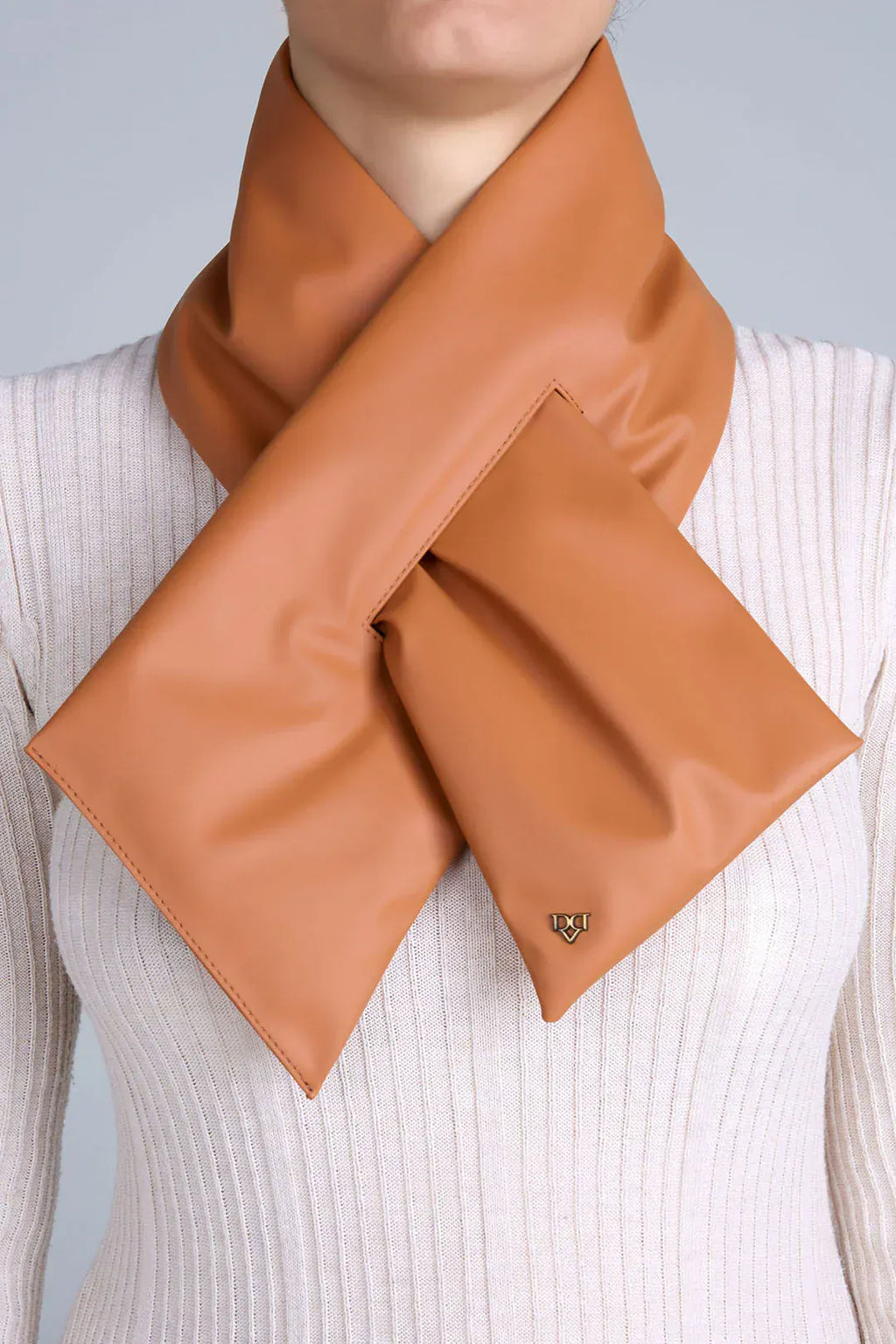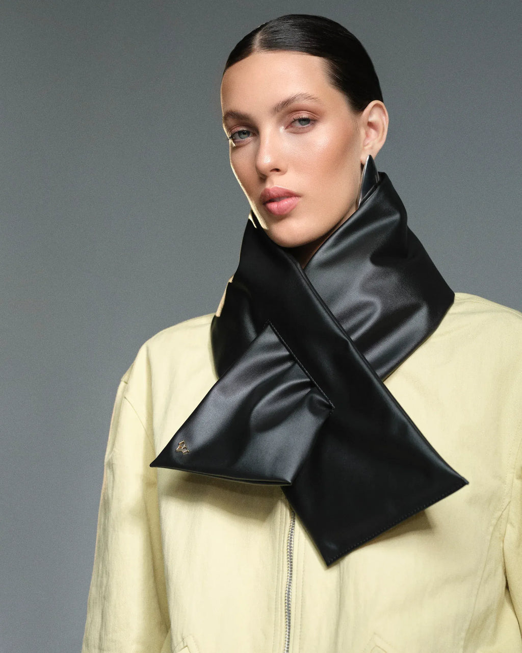 Designed with soft vegan leather made from olive tree waste. It wraps comfortably around your neck and offers light protection against the wind. A practical piece you can easily wear during chilly days, whether out and about or in the evening, doubling as a stylish accessory.