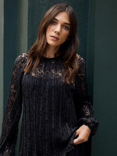 Whether it’s for dinner parties or dancefloors, a lacy black top will see you through any occasion in style. The Coline Top in recycled sheer lace is cut into a relaxed shape with raglan sleeves, gathering around the crew neckline, and a scallop-edge hem. Unlined, it can be styled with our Basia Slip Top underneath, or a black bra. An easy piece to elevate dark-wash jeans, it’s also chic with tailored trousers and leather miniskirts.