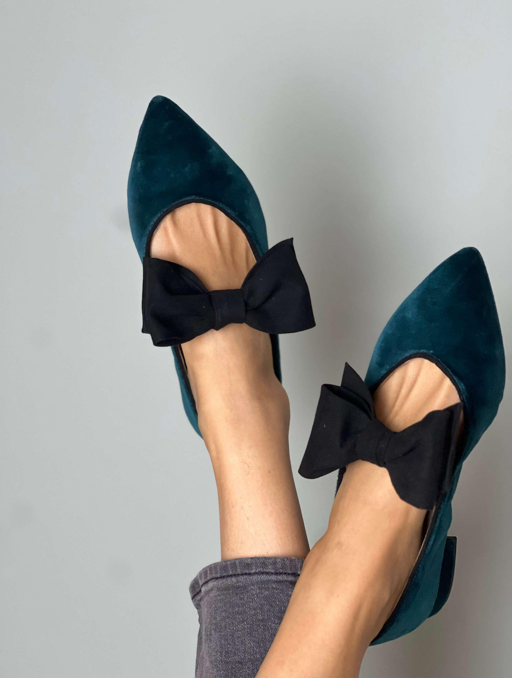 Introducing our elegant matching handbag and shoe set in soft green velvet. The shoes stand out with their sophisticated design, featuring a large black bow that adds a chic and feminine touch. Perfect for special occasions or for elevating your everyday style with a touch of luxury and originality. Look spectacular in this exclusive combination!