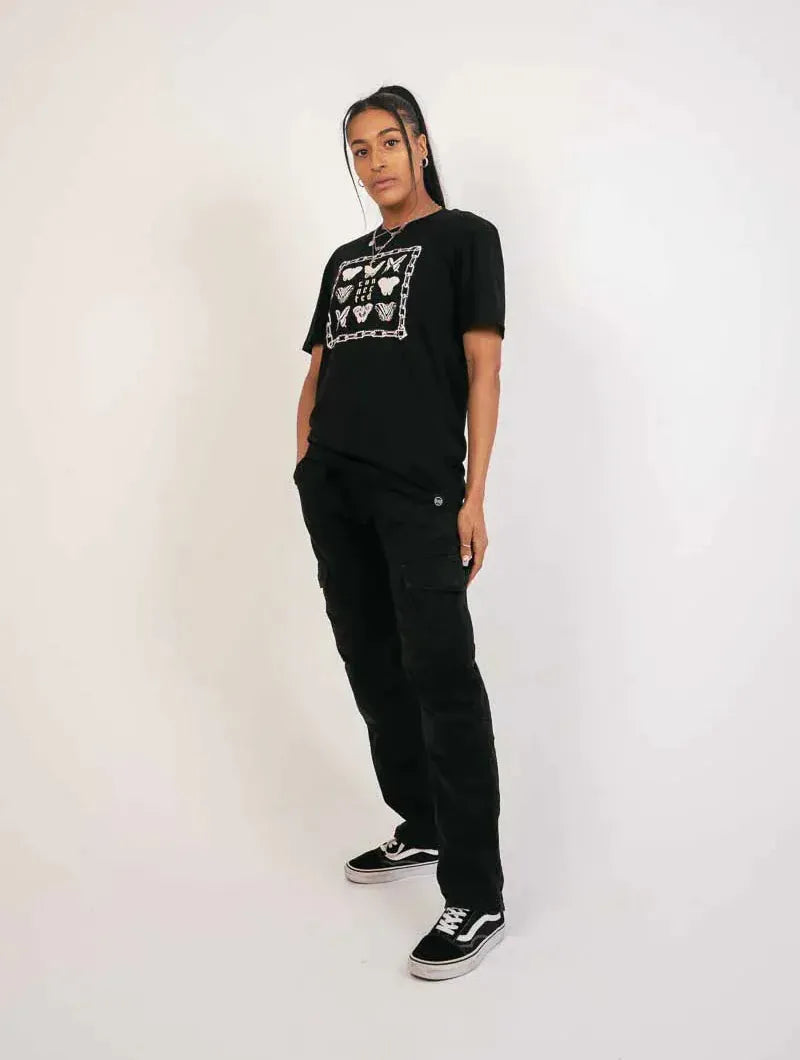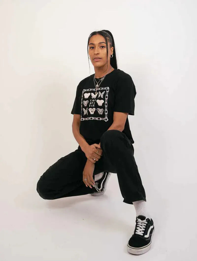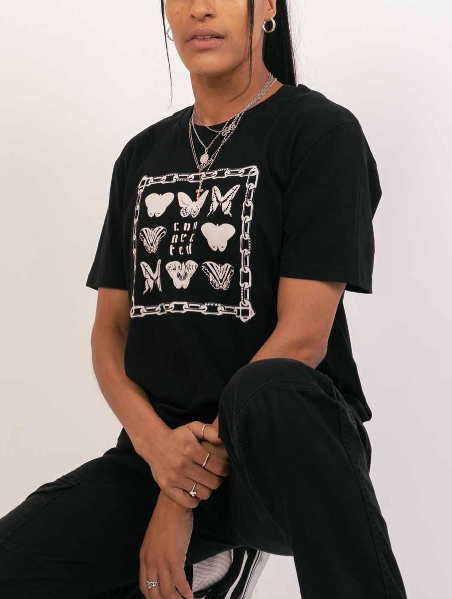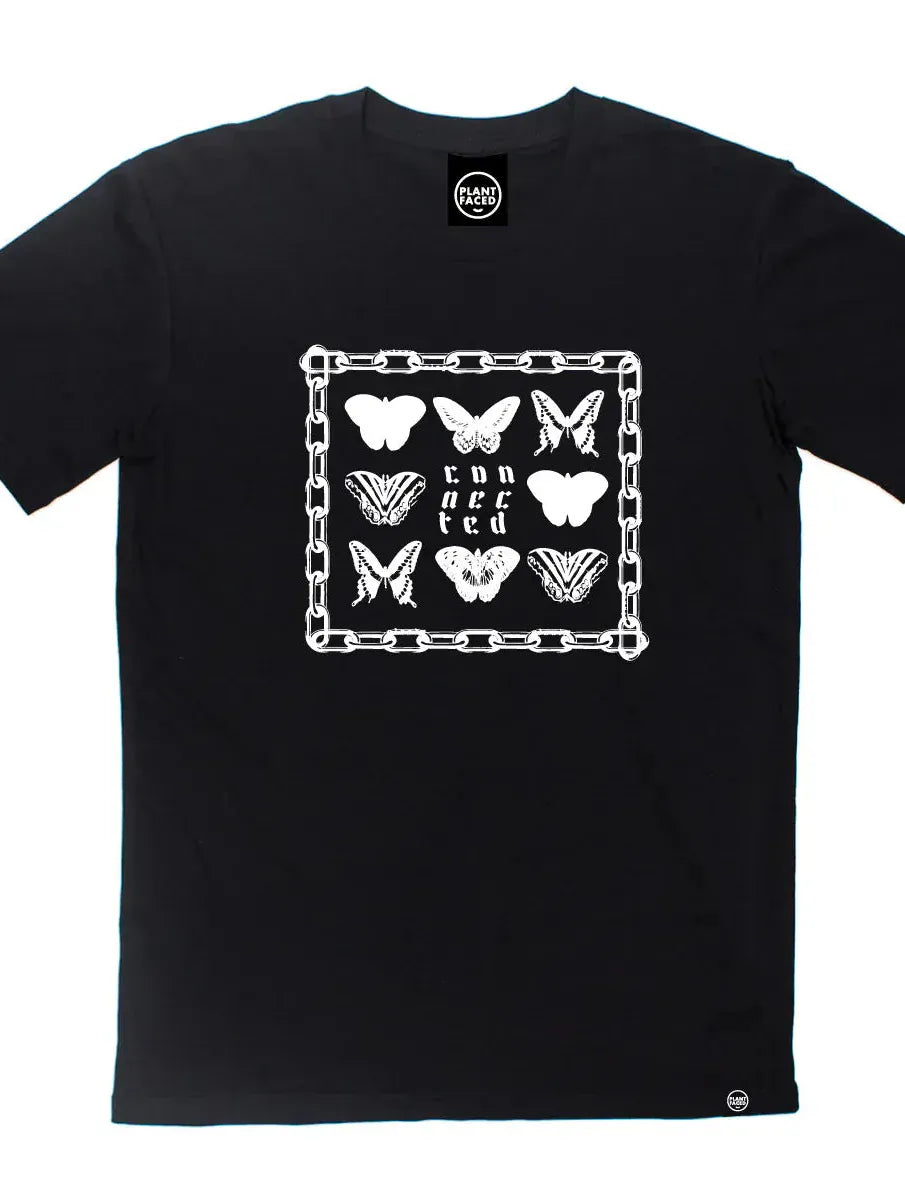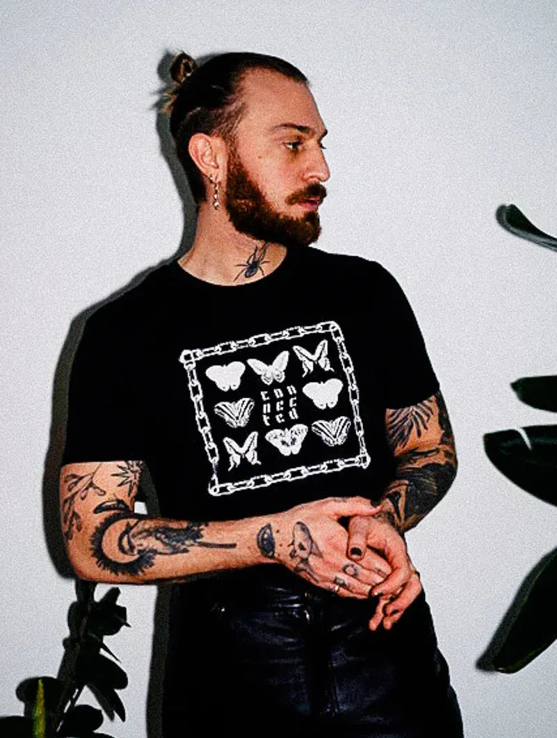 A delicate fusion of vintage-inspired butterfly prints and hidden phrases framed in chains, this design speaks to the quiet truth that every being - plant, animal, human - is deeply connected. A wearable reminder of interdependence in a fractured world.