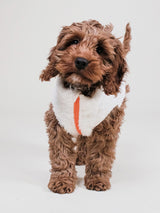 Available in seven sizes, finding the perfect fit for your furry companion is effortless. Elevate your pet's wardrobe with our Cream Sherpa Fleece Vest, featuring vibrant orange accent details on the zip and branding.