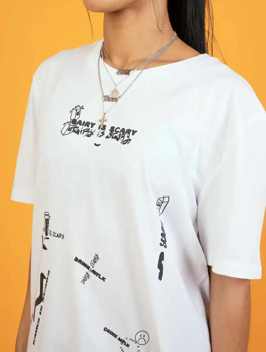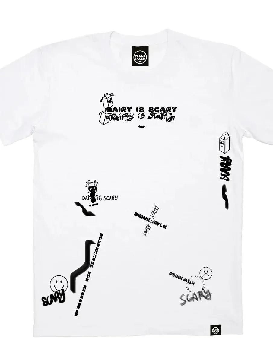 This graffiti-style collage tee takes the “Dairy Is Scary” slogan and throws it into organised anarchy - all bite, no bull. With a mix of gritty textures and bold contrasts, it’s activism wrapped in streetwear energy: cheeky, confronting, and impossible to scroll past.