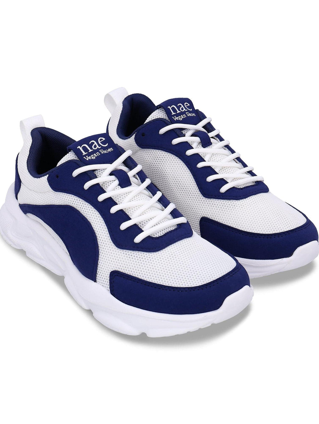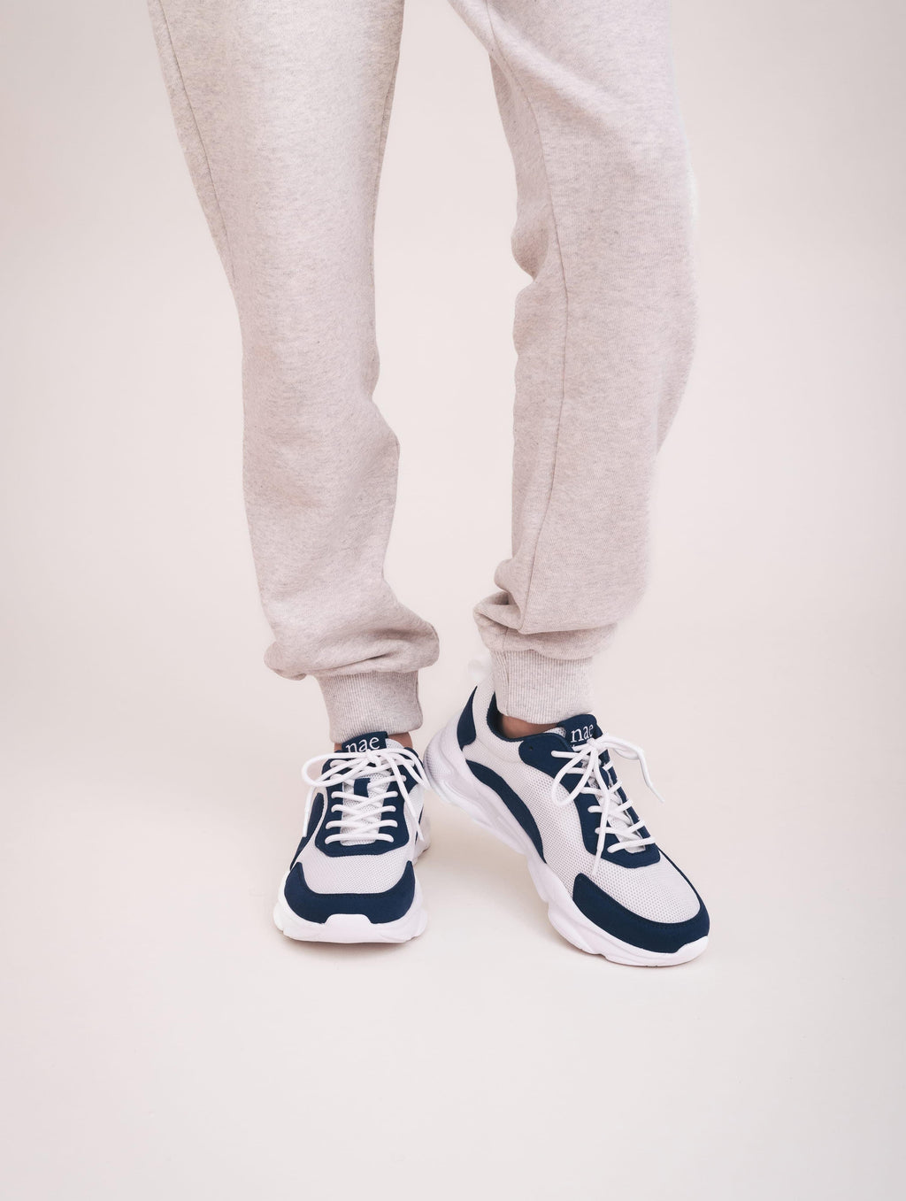 Unisex vegan sneakers made from breathable GRS-certified recycled PET mesh in a fresh white base, combined with soft blue vegan microsuede overlays and matching logo details. Dan blends a sporty, running-inspired silhouette with lightweight athleisure comfort, offering cushioning and flexibility through its EVA sole. A clean, modern colourway designed for everyday movement.
