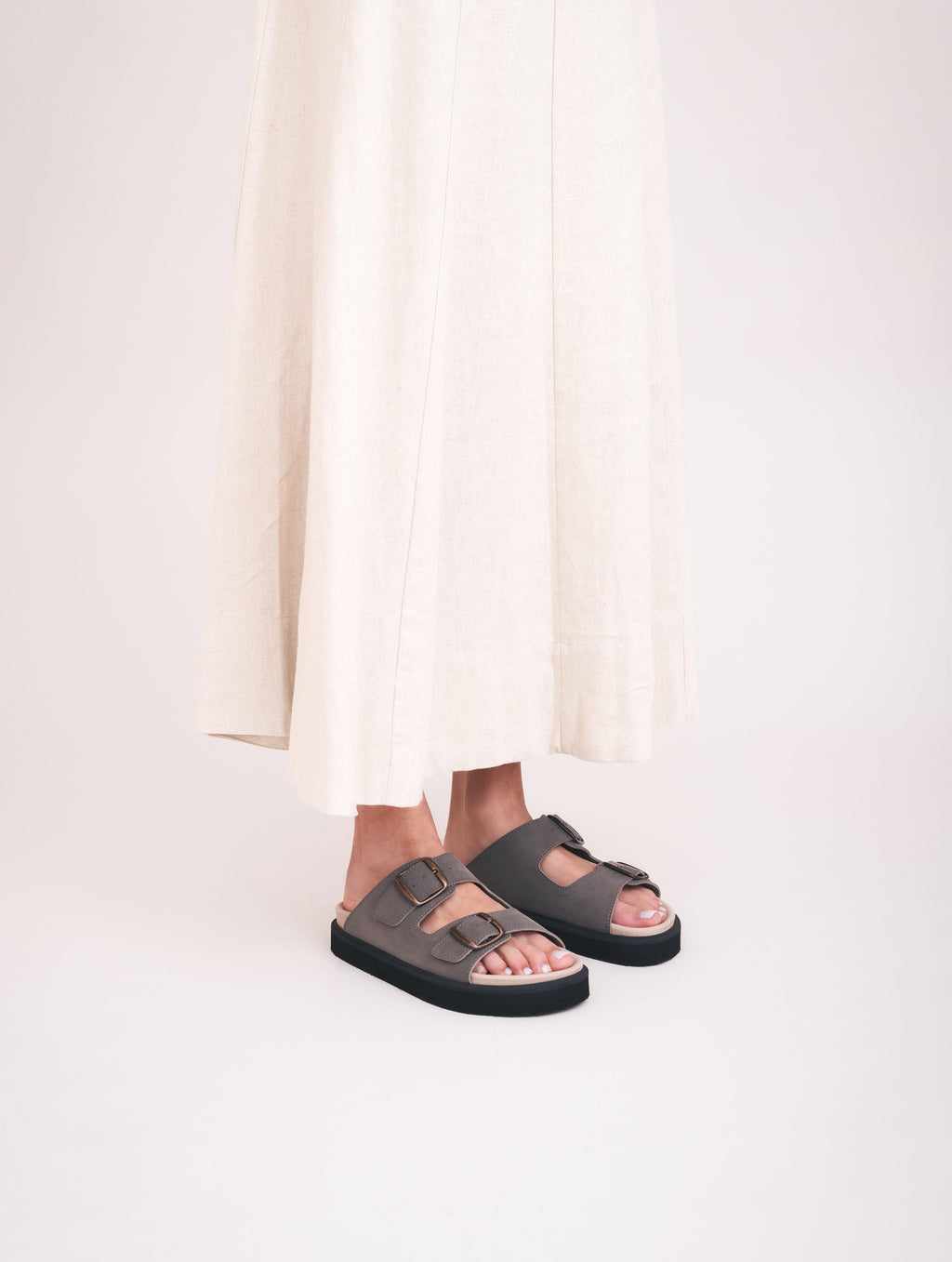 Darku is a minimalist vegan sandal with a contemporary silhouette. Made in Spain, it features a comfortable 2 cm ( 0.8 in ) platform and adjustable buckles for everyday support. Designed with conscious vegan materials, it offers a balanced blend of comfort, durability, and modern style.