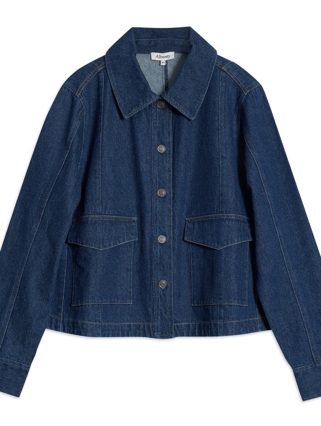 Designed with an A line silhouette, this Denim Jacket includes a button-down front with metallic buttons and front pockets with flap closures, offering both style and functionality. The indigo denim is accented by contrasting topstitching, adding to its tailored design with an off-duty edge. Perfect for layering or pairing with co-ordinating denim pieces. A versatile staple that transitions seamlessly into Autumn/Winter.