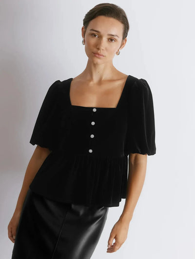 This black velvet peplum top features a square neckline, voluminous puff sleeves, and diamanté buttons, combining elegance with a touch of glamour.