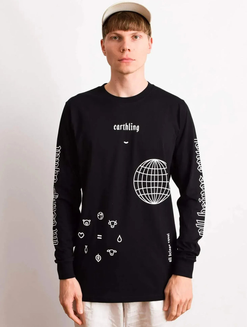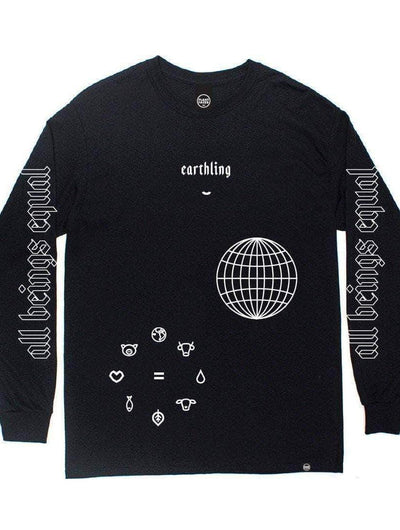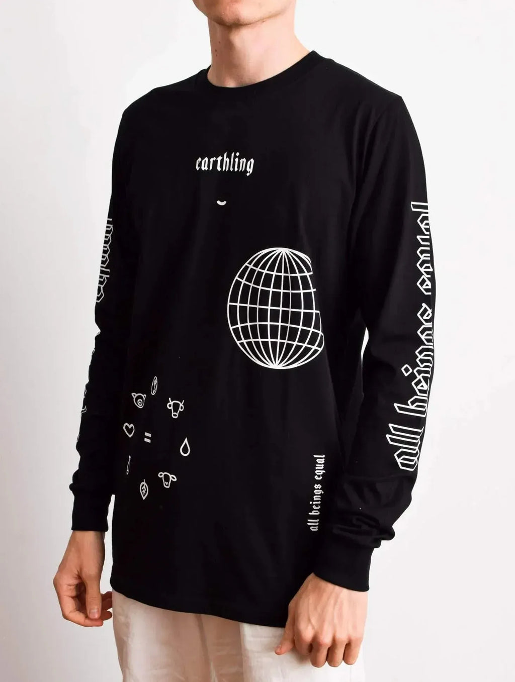 This isn’t just a shirt - it’s a signal. The “Earthling” long sleeve carries a futuristic edge with a minimalist symbology print that speaks volumes. Featuring a globe network graphic, equal beings icons, and gothic-style “all beings equal” sleeve prints, it’s a wearable manifesto for unity, empathy, and collective liberation.
