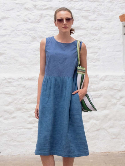Sleeveless cotton rich summer dress with broderie anglaise detailing made in a beautiful mediterranean blue. Simple, effortless and ageless. Very easy to dress up or down. The embroidered cotton on the bodice and light, airy double gauze cotton on the skirt give this dress a Bohemian feel.