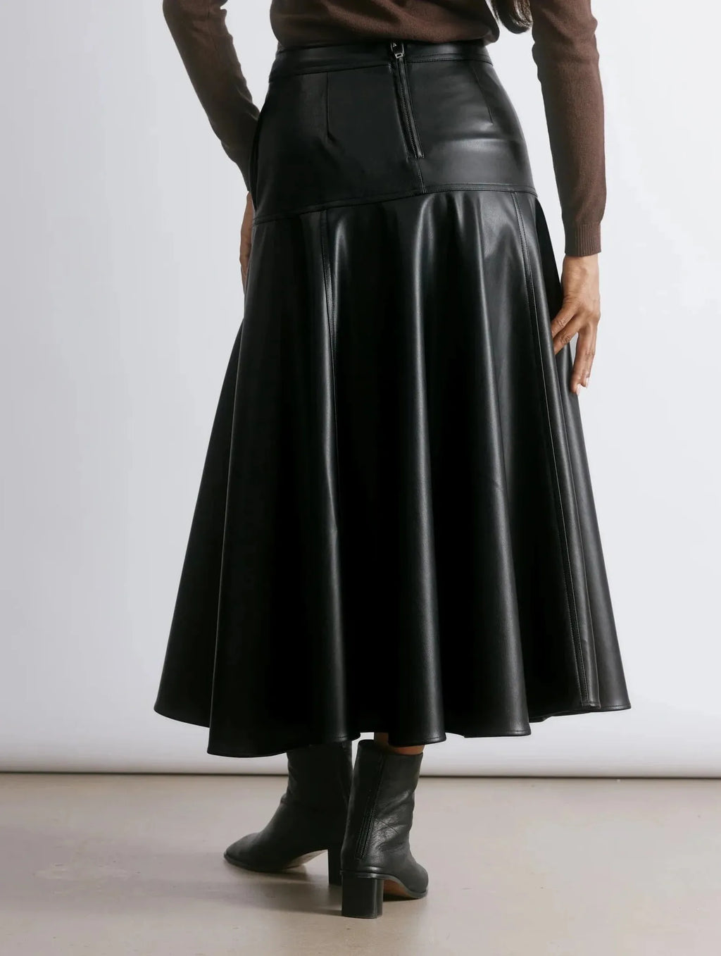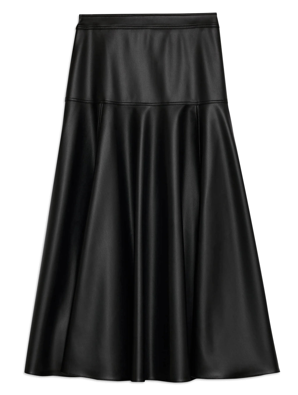 This black midi skirt is designed with a deep fitted waist and full skirt for a flattering silhouette .