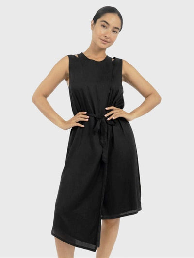 The loose A-line silhouette sleeveless dress features an asymmetric length. Displaying an eye-catching cut-out detail at the shoulders, whilst keeping the zipper hidden in the centre back. Wear the dress with the belt for a relaxed, yet curve-revealing waist.
