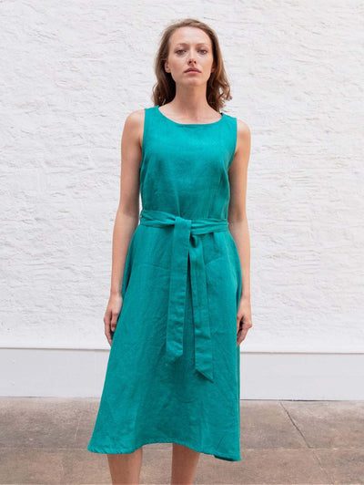 Sleeveless summer dress made in a pure natural linen. Rich emerald green. This dress has a full swingy skirt, cinched at the waist with a self-adjustable fabric belt. The midweight linen is pre-washed for softness, it will also soften further with wear. One of Bibico's classic styles, the Grace dress is versatile and can be dressed up or down. Boat neck. Tailored bodice. Invisible side zip. Self-adjustable fabric belt. Falls at mid-calf.