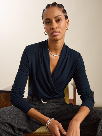 Elevate weekday outfits with the Gylda Wrap Top in navy. This easy style simply pulls on and comes with a fixed wrap feature. Made from our signature soft jersey, it drapes beautifully around the neckline and body, and is cut for a slim fit around the arms and waist. Effortlessly elegant, it lends a formal touch to trousers and denim.