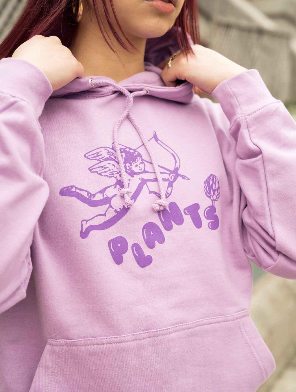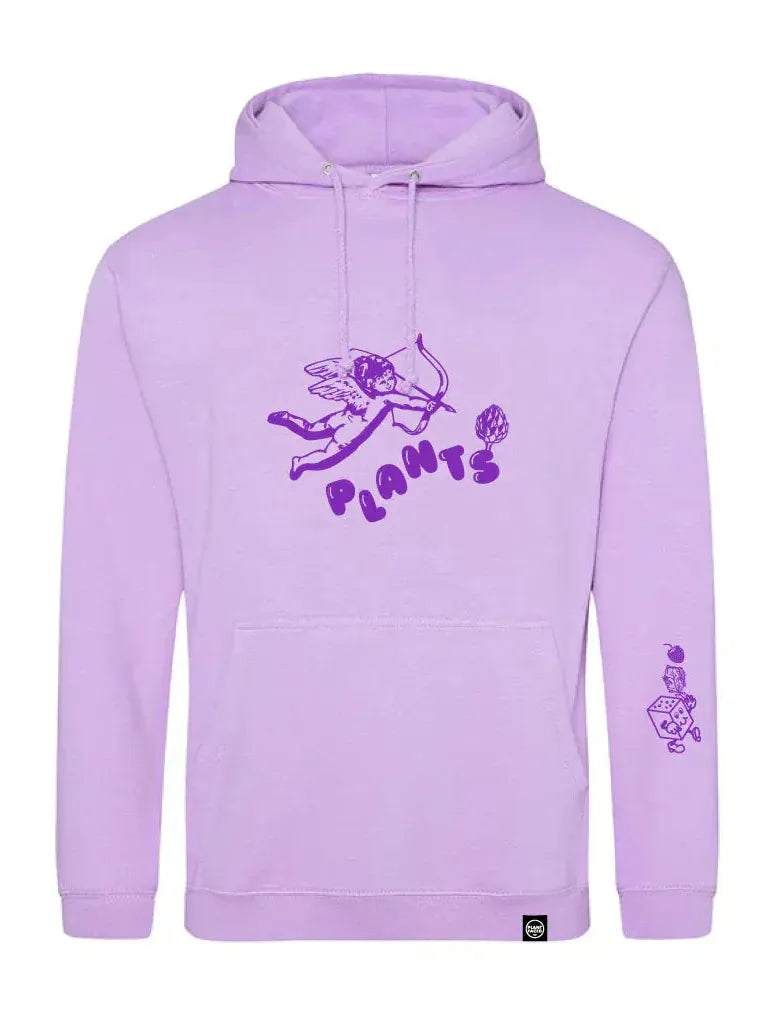 Lavender purple hoodie with fun PLANTS screen-printed bubble font graphic on front featuring sweet cherub cupid angel, artichoke, strawberry + tofu cartoon on sleeve (with "SOY U L8R" tiny text) holding kale leaf + floating strawberry, for all our plant loving friends☺️