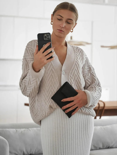 Our knitted herringbone line cardigan is a tribute to the classic herringbone pattern, making this monochrome piece a timeless show-stopper. It is made from 100% organic cotton with a relaxed fit, long sleeves, four front buttons and ribbed trims at the hems.