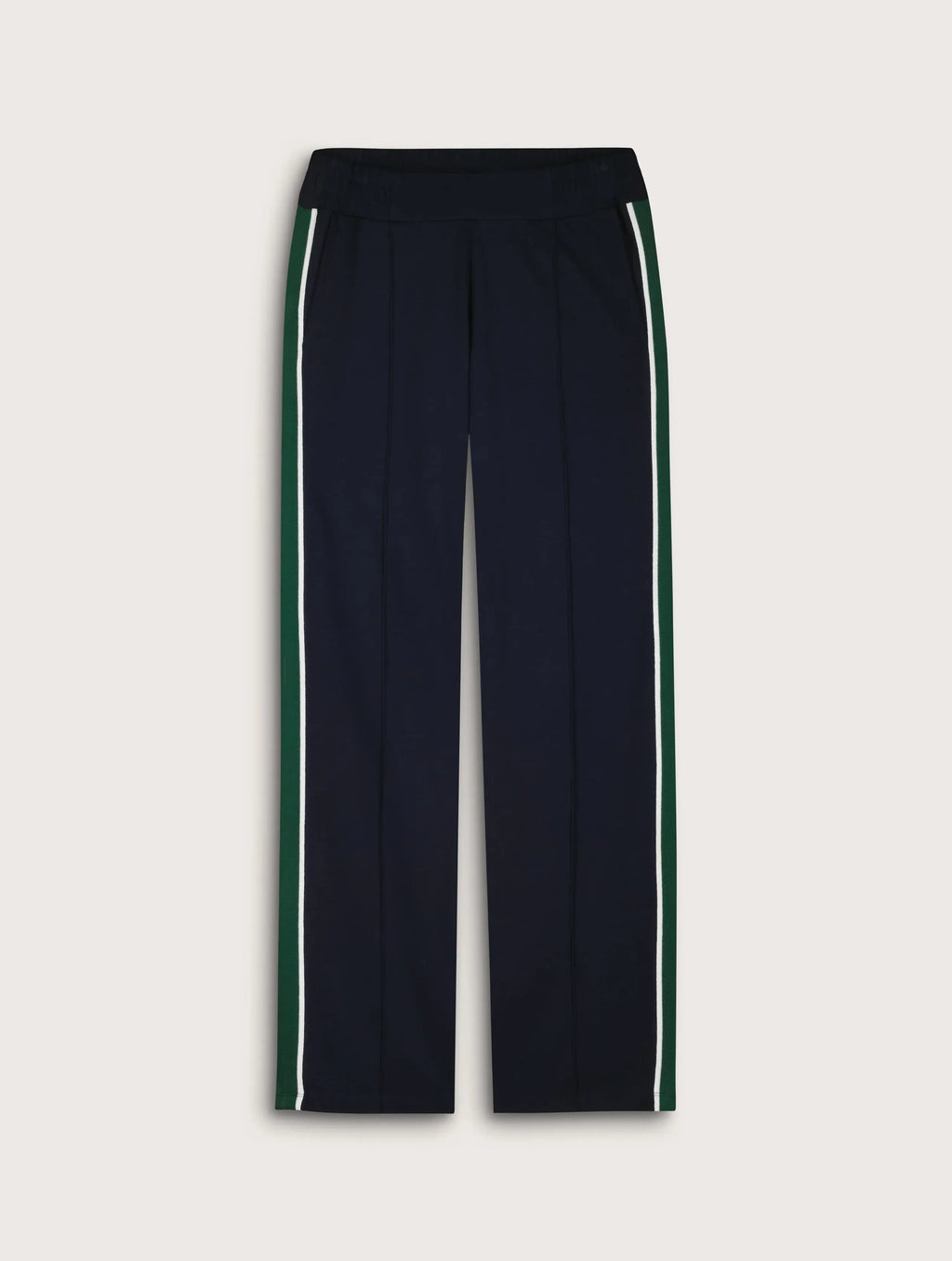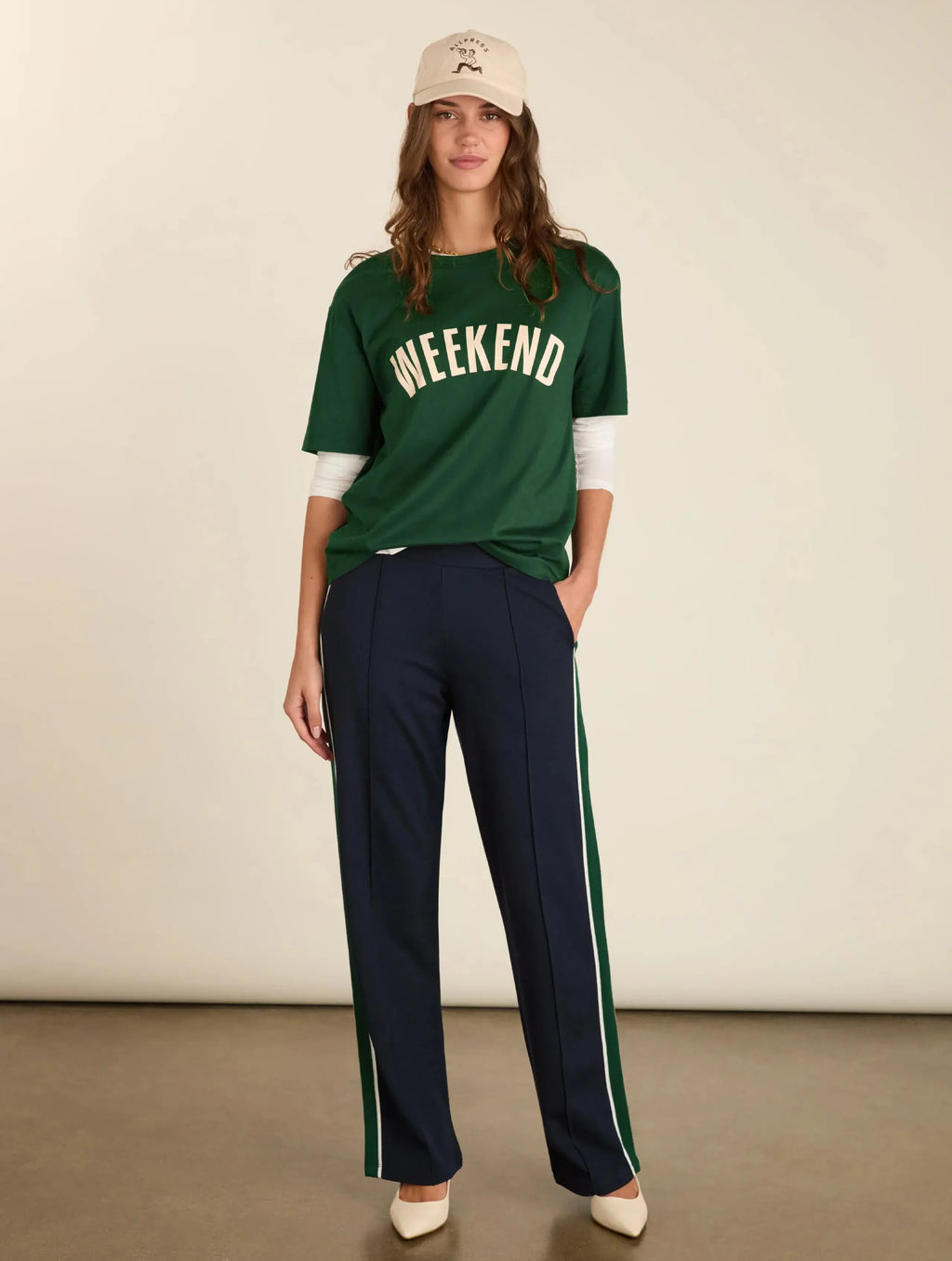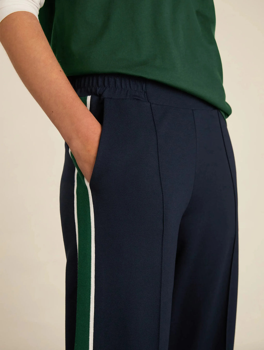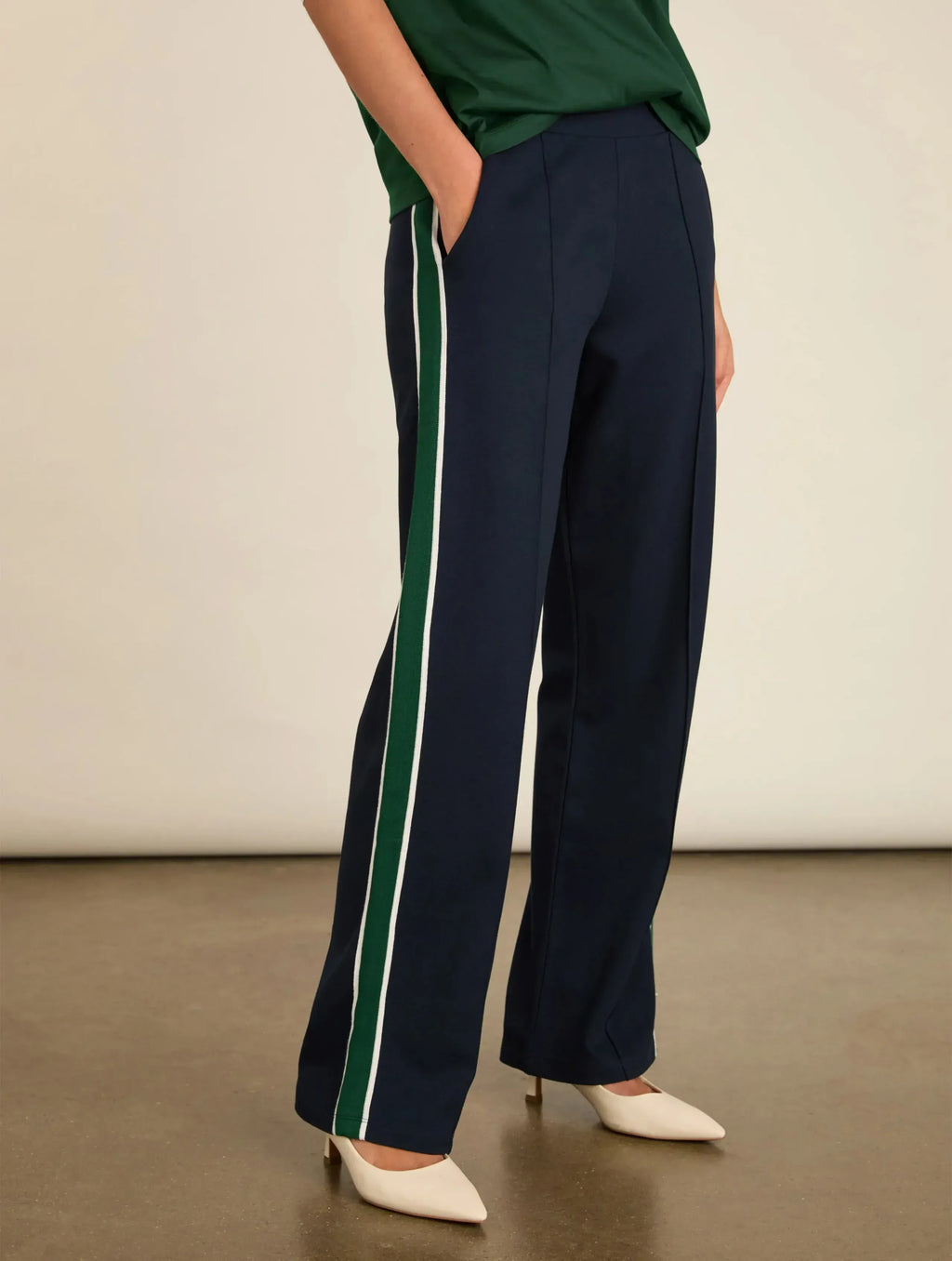 Relaxed weekend dressing is made easy with the Lisa Trousers. Tailored yet slouchy, this style in versatile navy simply pull-on for maximum comfort. Crafted in ponte, they are stretchy and softly structured with wide legs and a pintuck down each leg. The knitted side stripes elevate them from being mere joggers: tipped in green and white, they’re great to style with white tees, blazers and all your off-duty favourites.