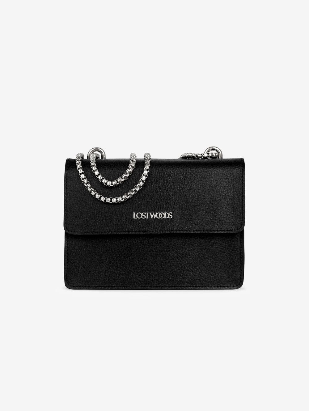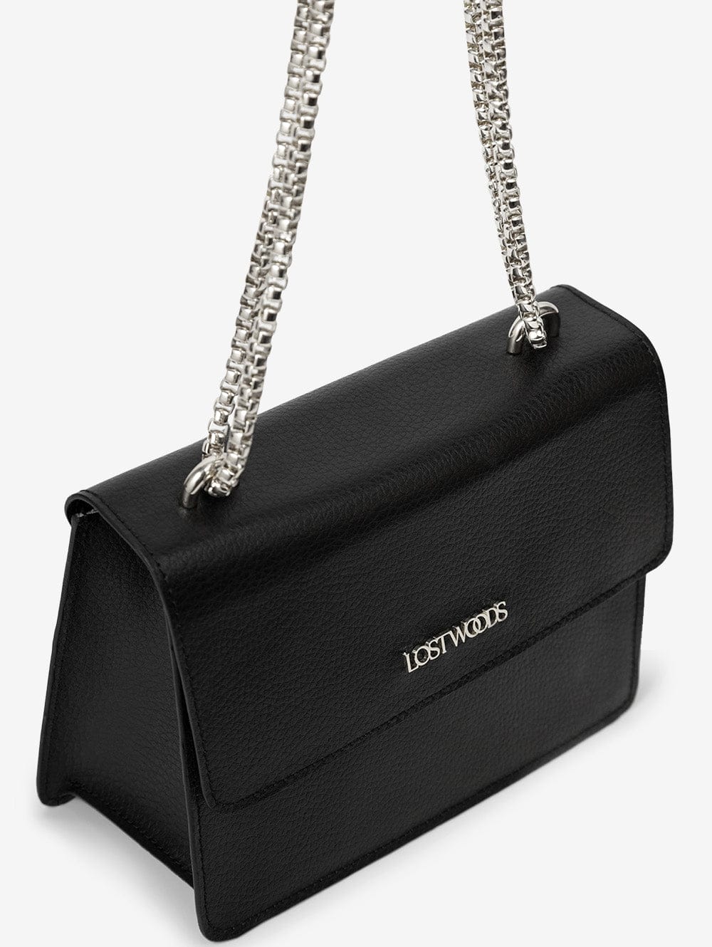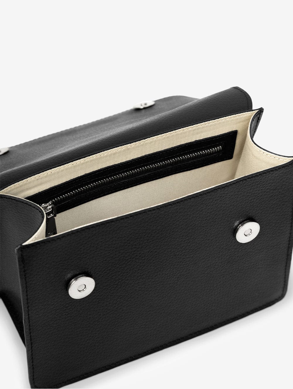 Willow is a small, square, structured handbag with a sparkling box chain. Convert it from a shoulder bag to a crossbody bag instantly with the pull-through strap. Fit your sunglasses, phone, makeup and headphones. Made from black textured MIRUM® plastic-free vegan leather, silver hardware and beige organic cotton lining.