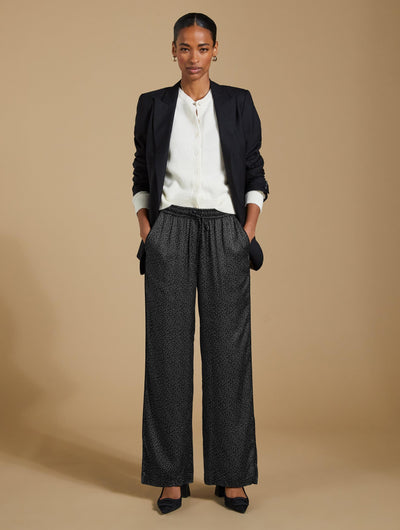 Add a playful twist to your wardrobe with the Mandy Satin Trousers. Featuring a chic black mini spot print on a satin finish, these wide-leg trousers are perfect for pairing with crisp white blouses or oversized tees. But our favourite way to style them is with the matching Saffron Satin Blouse for a chic, coordinated look. Cut in a wide-leg, pyjama-style silhouette, these trousers are perfect for bringing a bit of effortless elegance to your day.