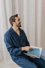 100% linen pajama set for men. Linen pants and shirt for a good night's sleep. The shirt is with wooden buttons and two pockets at the front. Pants are with an elastic band. Comfortable for sleep or chilling at home.