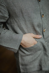 The model Tomas is 1.85m/ 6'1" and wearing size L in Blue Checks. Gaspard is 1.83cm/ 6" and wearing size L in Forest green, deep blue and berry red.