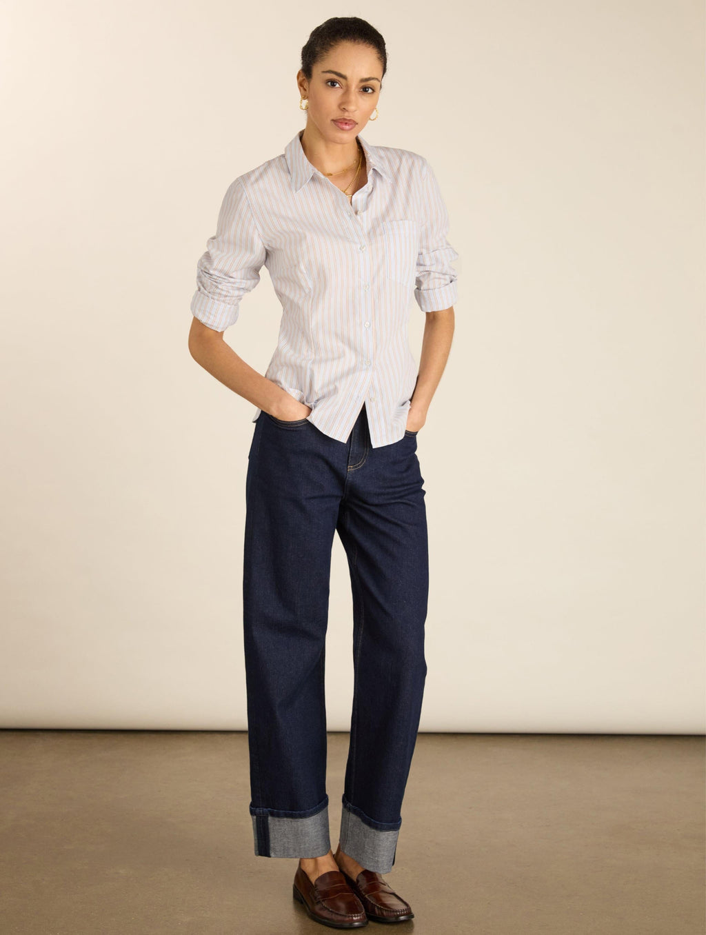 The Nicola Organic Cotton Shirt comes with fine, yarn-dyed stripes in blue, brown and pale yellow - and a shaped waist to accentuate your body. This nipped-in silhouette looks chic alongside a pair of wide-leg jeans or trousers. Topped with a patch pocket and a curved hem, it’s also ideal for refreshing your work wardrobe.