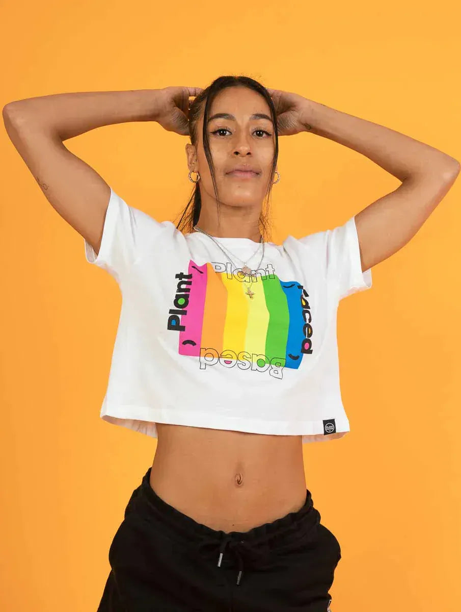 This slick white crop tee features a vibrant rainbow bar print with layered Plant Based / Plant Faced text and subtle smile accents that do all the talking. It’s got that head-turning energy while keeping things low-key - for those who know, you know 🌈😉
